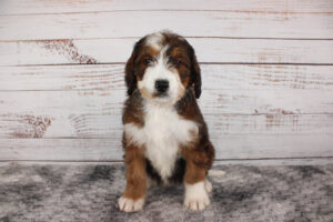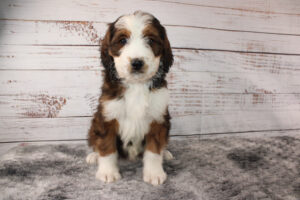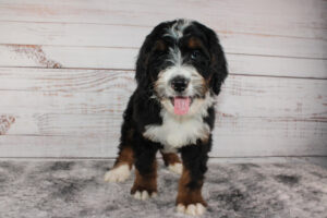 Our Standard Bernedoodle puppies are all F1 – meaning 1st generation- puppies. All moms are purebred Bernese Mountain dogs. Dads to the puppies are Standard poodles. A standard-sized Bernedoodle can weigh 60-90 pounds and be 27-30 inches tall as an adult. Their life expectancy is 12-18 years.