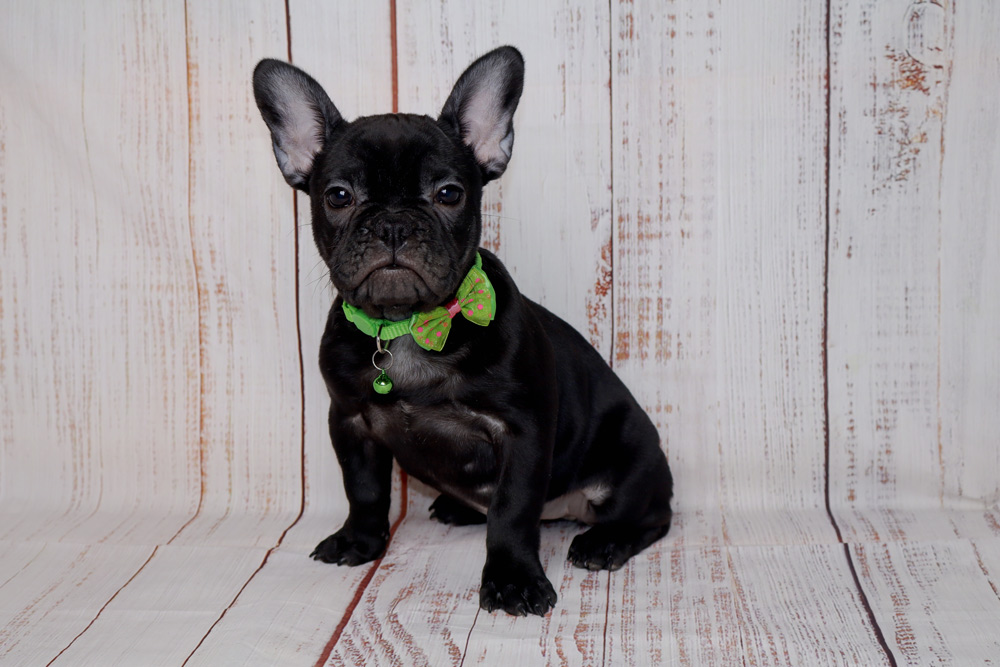 The French Bulldogs vary in color from fawn, white, chocolate, liver, black, brindle, pied, lilac, merle patterned, black & tan, and blue/gray. Because of their short face, thick-boned body, and non-aggressive temperament, they are considered a non-sporting dog breed. The Frenchies range from 11-13 inches in height, and weigh approx 25-30 pounds, with a life span of 10-13 years.