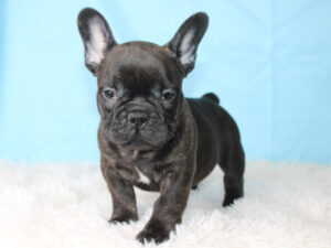 The French Bulldogs vary in color from fawn, white, chocolate, liver, black, brindle, pied, lilac, merle patterned, black & tan, and blue/gray. Because of their short face, thick-boned body, and non-aggressive temperament, they are considered a non-sporting dog breed. The Frenchies range from 11-13 inches in height, and weigh approx 25-30 pounds, with a life span of 10-13 years.