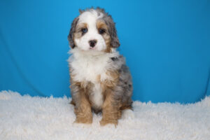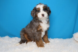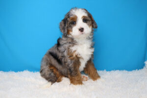 The famous Mini Bernedoodle crossbreed is a mix between a mini poodle or toy poodle and the legendary Bernese Mountain Dog breed.  Mini Bernedoodle Puppies offer the best traits and characteristics of both the Mini Poodle and Bernese Mountain dog.  From the toy or mini poodle side, they get low shedding, hypoallergenic coats, intelligence, and a more laid-back temperament and energy level.   From the Bernese Mountain Dog side, they get loyalty, Friendliness, and playful attitudes.   If you’re looking for a dog similar to the Bernese mountain dog but want a smaller more hypoallergenic dog then a mini bernedoodle puppy is a great choice. Also, most bernedoodles are dry-mouthed and don’t drool like traditional Bernese Mountain dogs.  This breed is usually non-aggressive, gentle, friendly, and makes great family pets.