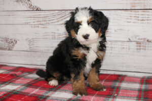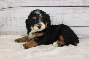 Looking for a Bernedoodle but want a smaller size? Our Mini Bernedoodles may be just what you are looking for! All puppies are F1 – meaning 1st generation – puppies. All moms are purebred Bernese Mountain dogs. Dads to the puppies are Toy or Mini Poodles. A mini Bernedoodle can weigh 25-55 pounds and be 18-22 inches tall as an adult. Their life expectancy is 12-18 years. A mini Bernedoodle typically has a longer lifespan than a Standard Bernedoodle due to being smaller in size.