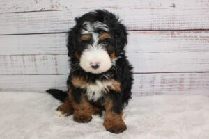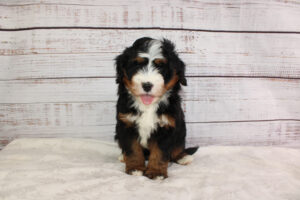 The famous Mini Bernedoodle crossbreed is a mix between a mini poodle or toy poodle and the legendary Bernese Mountain Dog breed.  Mini Bernedoodle Puppies offer the best traits and characteristics of both the Mini Poodle and Bernese Mountain dog.  From the toy or mini poodle side, they get low shedding, hypoallergenic coats, intelligence, and a more laid-back temperament and energy level.   From the Bernese Mountain Dog side, they get loyalty, Friendliness, and playful attitudes.   If you’re looking for a dog similar to the Bernese mountain dog but want a smaller more hypoallergenic dog then a mini bernedoodle puppy is a great choice. Also, most bernedoodles are dry-mouthed and don’t drool like traditional Bernese Mountain dogs.  This breed is usually non-aggressive, gentle, friendly, and makes great family pets.