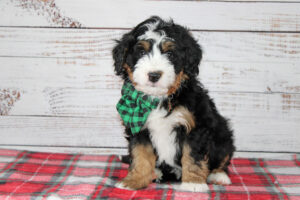 The famous Mini Bernedoodle crossbreed is a mix between a mini poodle or toy poodle and the legendary Bernese Mountain Dog breed.  Mini Bernedoodle Puppies offer the best traits and characteristics of both the Mini Poodle and Bernese Mountain dog.  From the toy or mini poodle side, they get low shedding, hypoallergenic coats, intelligence, and a more laid-back temperament and energy level.   From the Bernese Mountain Dog side, they get loyalty, Friendliness, and playful attitudes.   If you’re looking for a dog similar to the Bernese mountain dog but want a smaller more hypoallergenic dog then a mini bernedoodle puppy is a great choice. Also, most bernedoodles are dry-mouthed and don’t drool like traditional Bernese Mountain dogs.  This breed is usually non-aggressive, gentle, friendly, and makes great family pets.
