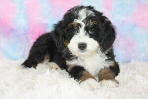 The famous Mini Bernedoodle crossbreed is a mix between a mini poodle or toy poodle and the legendary Bernese Mountain Dog breed.  Mini Bernedoodle Puppies offer the best traits and characteristics of both the Mini Poodle and Bernese Mountain dog.  From the toy or mini poodle side, they get low shedding, hypoallergenic coats, intelligence, and a more laid-back temperament and energy level.   From the Bernese Mountain Dog side, they get loyalty, Friendliness, and playful attitudes.   If you’re looking for a dog similar to the Bernese mountain dog but want a smaller more hypoallergenic dog then a mini bernedoodle puppy is a great choice. Also, most bernedoodles are dry-mouthed and don’t drool like traditional Bernese Mountain dogs.  This breed is usually non-aggressive, gentle, friendly, and makes great family pets.