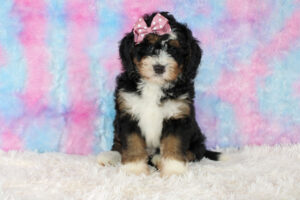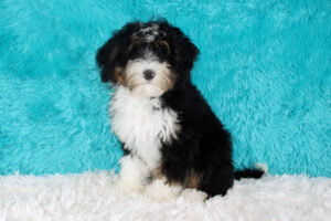 The famous Mini Bernedoodle crossbreed is a mix between a mini poodle or toy poodle and the legendary Bernese Mountain Dog breed.  Mini Bernedoodle Puppies offer the best traits and characteristics of both the Mini Poodle and Bernese Mountain dog.  From the toy or mini poodle side, they get low shedding, hypoallergenic coats, intelligence, and a more laid-back temperament and energy level.   From the Bernese Mountain Dog side, they get loyalty, Friendliness, and playful attitudes.   If you’re looking for a dog similar to the Bernese mountain dog but want a smaller more hypoallergenic dog then a mini bernedoodle puppy is a great choice. Also, most bernedoodles are dry-mouthed and don’t drool like traditional Bernese Mountain dogs.  This breed is usually non-aggressive, gentle, friendly, and makes great family pets.