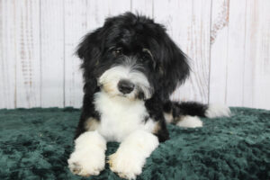 The famous Mini Bernedoodle crossbreed is a mix between a mini poodle or toy poodle and the legendary Bernese Mountain Dog breed.  Mini Bernedoodle Puppies offer the best traits and characteristics of both the Mini Poodle and Bernese Mountain dog.  From the toy or mini poodle side, they get low shedding, hypoallergenic coats, intelligence, and a more laid-back temperament and energy level.   From the Bernese Mountain Dog side, they get loyalty, Friendliness, and playful attitudes.   If you’re looking for a dog similar to the Bernese mountain dog but want a smaller more hypoallergenic dog then a mini bernedoodle puppy is a great choice. Also, most bernedoodles are dry-mouthed and don’t drool like traditional Bernese Mountain dogs.  This breed is usually non-aggressive, gentle, friendly, and makes great family pets.