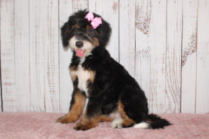 Looking for a Bernedoodle but want a smaller size? Our Mini Bernedoodles may be just what you are looking for! All puppies are F1 – meaning 1st generation – puppies. All moms are purebred Bernese Mountain dogs. Dads to the puppies are Toy or Mini Poodles. A mini Bernedoodle can weigh 25-55 pounds and be 18-22 inches tall as an adult. Their life expectancy is 12-18 years. A mini Bernedoodle typically has a longer lifespan than a Standard Bernedoodle due to being smaller in size.