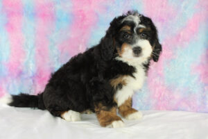The famous Mini Bernedoodle crossbreed is a mix between a mini poodle or toy poodle and the legendary Bernese Mountain Dog breed.  Mini Bernedoodle Puppies offer the best traits and characteristics of both the Mini Poodle and Bernese Mountain dog.  From the toy or mini poodle side, they get low shedding, hypoallergenic coats, intelligence, and a more laid-back temperament and energy level.   From the Bernese Mountain Dog side, they get loyalty, Friendliness, and playful attitudes.   If you’re looking for a dog similar to the Bernese mountain dog but want a smaller more hypoallergenic dog then a mini bernedoodle puppy is a great choice. Also, most bernedoodles are dry-mouthed and don’t drool like traditional Bernese Mountain dogs.  This breed is usually non-aggressive, gentle, friendly, and makes great family pets.