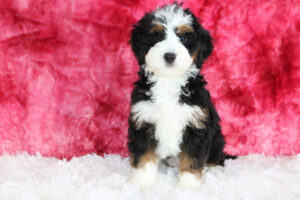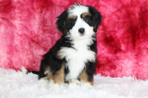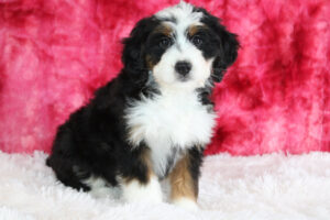 The famous Mini Bernedoodle crossbreed is a mix between a mini poodle or toy poodle and the legendary Bernese Mountain Dog breed.  Mini Bernedoodle Puppies offer the best traits and characteristics of both the Mini Poodle and Bernese Mountain dog.  From the toy or mini poodle side, they get low shedding, hypoallergenic coats, intelligence, and a more laid-back temperament and energy level.   From the Bernese Mountain Dog side, they get loyalty, Friendliness, and playful attitudes.   If you’re looking for a dog similar to the Bernese mountain dog but want a smaller more hypoallergenic dog then a mini bernedoodle puppy is a great choice. Also, most bernedoodles are dry-mouthed and don’t drool like traditional Bernese Mountain dogs.  This breed is usually non-aggressive, gentle, friendly, and makes great family pets.