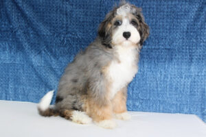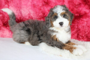 The famous Mini Bernedoodle crossbreed is a mix between a mini poodle or toy poodle and the legendary Bernese Mountain Dog breed.  Mini Bernedoodle Puppies offer the best traits and characteristics of both the Mini Poodle and Bernese Mountain dog.  From the toy or mini poodle side, they get low shedding, hypoallergenic coats, intelligence, and a more laid-back temperament and energy level.   From the Bernese Mountain Dog side, they get loyalty, Friendliness, and playful attitudes.   If you’re looking for a dog similar to the Bernese mountain dog but want a smaller more hypoallergenic dog then a mini bernedoodle puppy is a great choice. Also, most bernedoodles are dry-mouthed and don’t drool like traditional Bernese Mountain dogs.  This breed is usually non-aggressive, gentle, friendly, and makes great family pets.