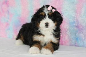Looking for a Bernedoodle but want a smaller size? Our Mini Bernedoodles may be just what you are looking for! All puppies are F1 – meaning 1st generation – puppies. All moms are purebred Bernese Mountain dogs. Dads to the puppies are Toy or Mini Poodles. A mini Bernedoodle can weigh 25-55 pounds and be 18-22 inches tall as an adult. Their life expectancy is 12-18 years. A mini Bernedoodle typically has a longer lifespan than a Standard Bernedoodle due to being smaller in size.