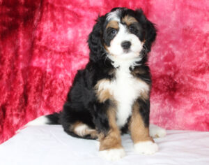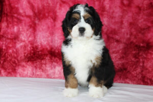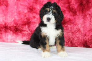 The famous Mini Bernedoodle crossbreed is a mix between a mini poodle or toy poodle and the legendary Bernese Mountain Dog breed.  Mini Bernedoodle Puppies offer the best traits and characteristics of both the Mini Poodle and Bernese Mountain dog.  From the toy or mini poodle side, they get low shedding, hypoallergenic coats, intelligence, and a more laid-back temperament and energy level.   From the Bernese Mountain Dog side, they get loyalty, Friendliness, and playful attitudes.   If you’re looking for a dog similar to the Bernese mountain dog but want a smaller more hypoallergenic dog then a mini bernedoodle puppy is a great choice. Also, most bernedoodles are dry-mouthed and don’t drool like traditional Bernese Mountain dogs.  This breed is usually non-aggressive, gentle, friendly, and makes great family pets.