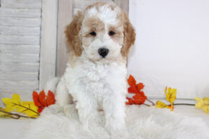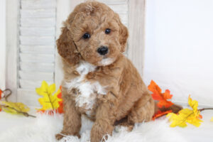 Most mini Goldendoodles favor the poodle side of the mix and usually have shorter wavy/curlier hair than a poodle.  Others can have more of a shaggy coat like that of a Golden retriever The colors of mini doodles vary and get inherited from both of the puppy’s parents.  Some can be solid colored and some are multi-colored with patterns.   The most prominent colors of mini Goldendoodles are Brown, Cream, Apricot, Red, White, and Golden colors.