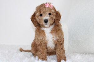 Most mini Goldendoodles favor the poodle side of the mix and usually have shorter wavy/curlier hair than a poodle.  Others can have more of a shaggy coat like that of a Golden retriever The colors of mini doodles vary and get inherited from both of the puppy’s parents.  Some can be solid colored and some are multi-colored with patterns.   The most prominent colors of mini Goldendoodles are Brown, Cream, Apricot, Red, White, and Golden colors.