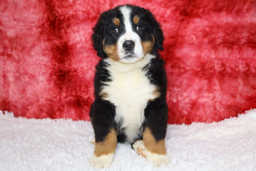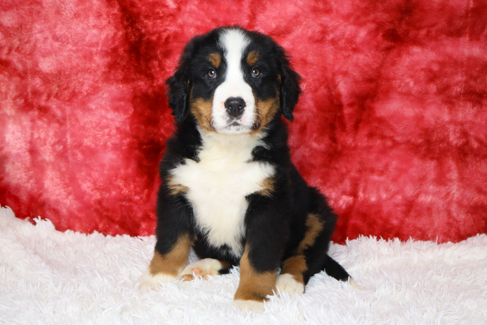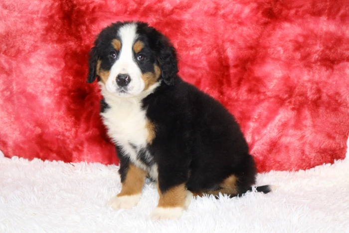 The Bernese Mountain Dog is a large, tri-colored working dog breed with one of the most consistently gentle temperaments you’ll find at that size. They are very devoted to their families, patient with children, and calm indoors to be manageable even at 80-110 pounds. The size requires real commitment. Families who choose a Bernese are choosing a dog that needs regular brushing, thrives on being close to the people it lives with, and doesn’t do well left alone for long stretches. We raise our Bernese Mountain Dog puppies on the farm alongside our other breeds, which means they’re socialized from birth by people, activity, and other animals.