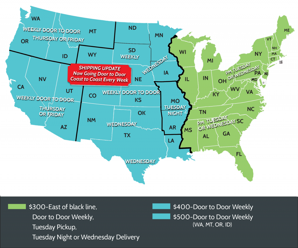We offer Economy Ground Delivery anywhere in the USA for $300-$500 depending on your state. This is amount is due to the delivery service. The ground delivery service is typically completed within 1-2 days depending on your location. We highly recommend the ground delivery service as someone is with your puppy at all times. The delivery service provides your puppy with food, water and keep your puppy clean throughout their entire journey. Please be assured your puppy will have the best of care during the delivery process. You the customer, will be contacted by the delivery service with an ETA 1-2 days prior departure. Final balance for your puppy is due to Blue Diamond Family Pups 2 business days before departure. Please see the map below for estimated drop off day/time.