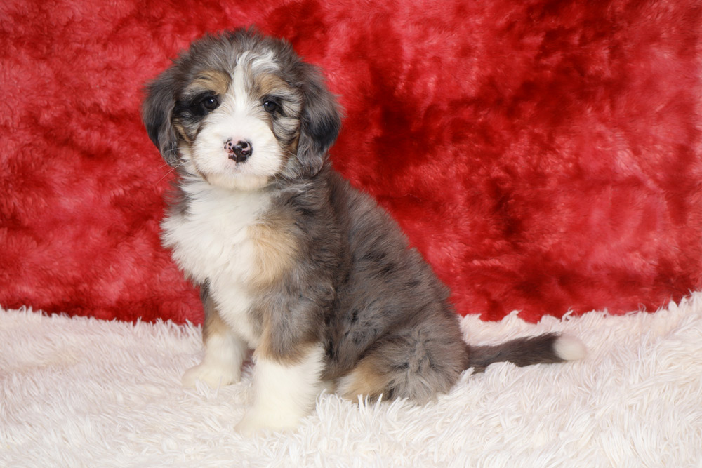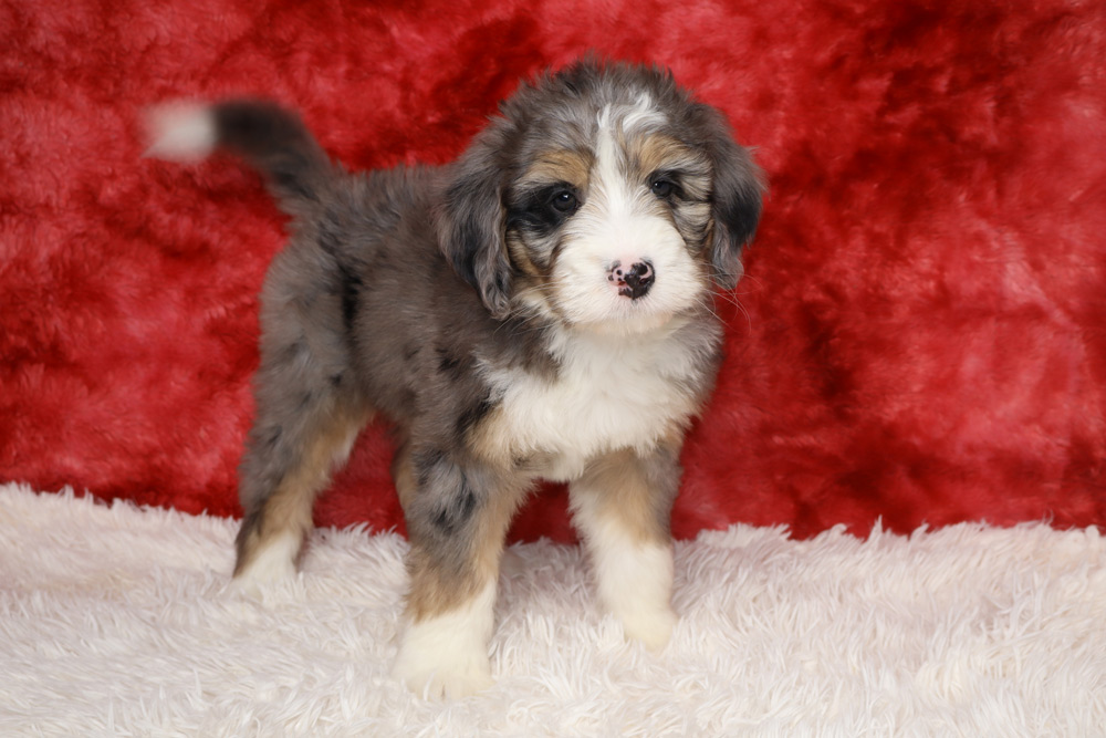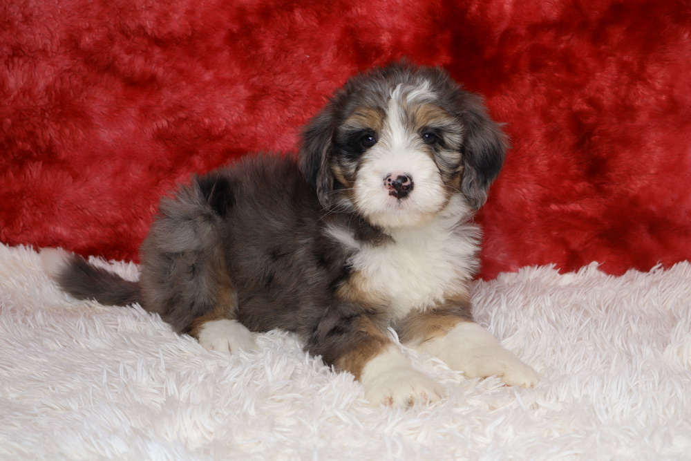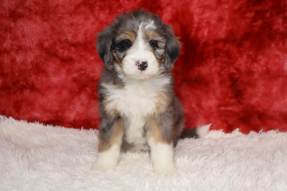 If Dora the explorer had a Bernedoodle, Justine would happily be her sidekick because she gets absolutely energized getting the opportunity to expand her horizons! We love that she is friendly, patient, and yielding but keeps her brain politely engaged in everyone’s happenings or calmly plops on the floor to joyfully observe the chaos with a smile on her face and lots of joyous wags coming from her tail! Justine is a pretty easy going girl but has a competitive side when it comes to being included and having attention- so her new family should legitimately want a gal pal to join them in their activities no matter how mundane or crazy fun! If you are looking for a humble yet confident pup who is affectionate and kind- Justine is the one for you!
