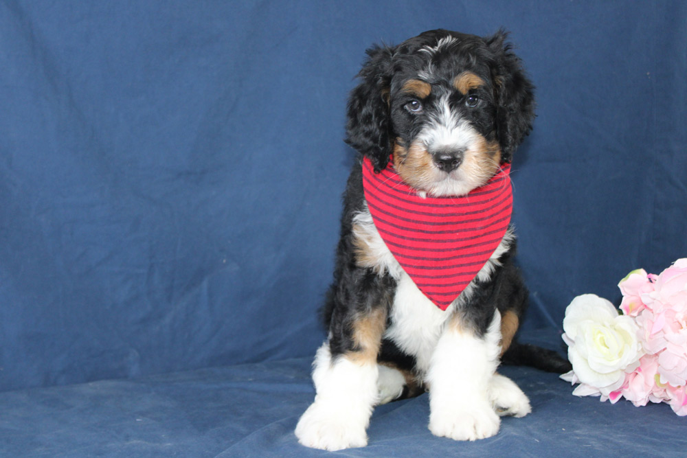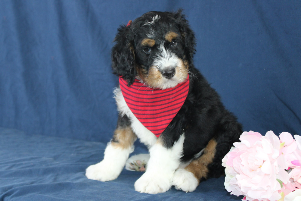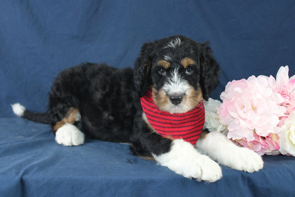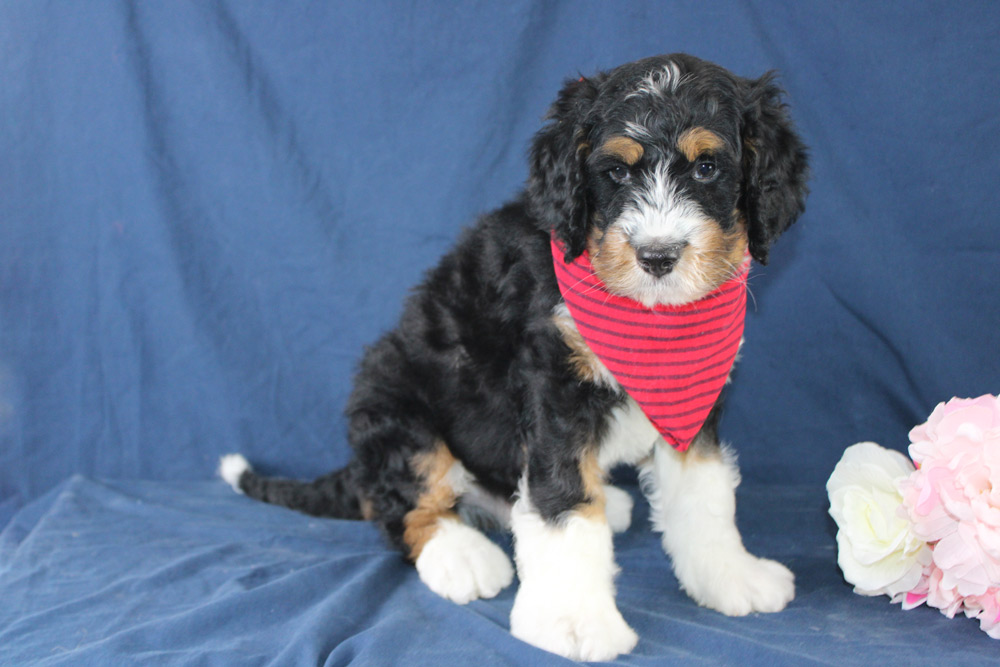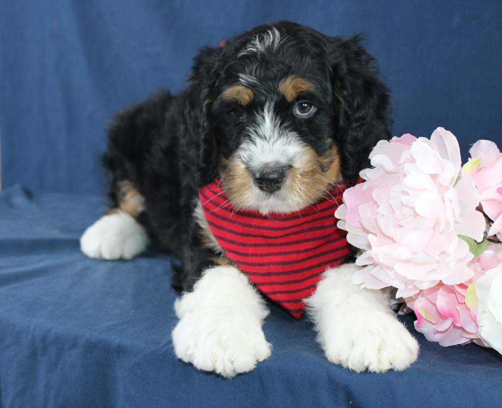 We know Bernedoodles are sought after for being calm companions- but our boy Nyle takes it to a whole other level of lazy! Needless to say- he is mild and mellow, with every single one of his littermates knowing how to use his indifference to them to their advantage. Nyle has become the personal lay-z-boy or crash pad to siblings who need a comfy place to sit or a soft place to land! This puppy is too sweet and too stoic to get offended over anything- though we have caught a certain gaze in his eyes that makes us think he’s beyond ready to be rid of his blood relatives and enter into a new era of the human pack dynamic! We cannot imagine Nyle loving life with a family of energetic athletes- however a family of bookworms and binge watching weirdos would be right up his ally! If you need a sweet creature to curl up and be your calm companion- Nyles is the one for you!