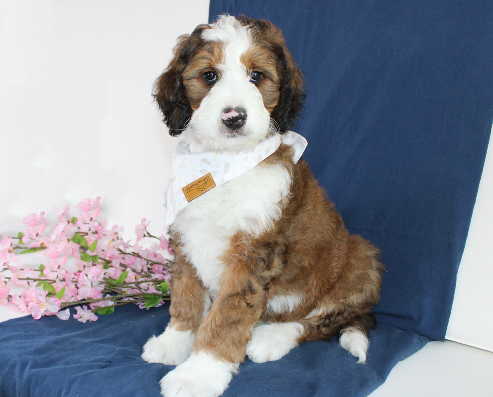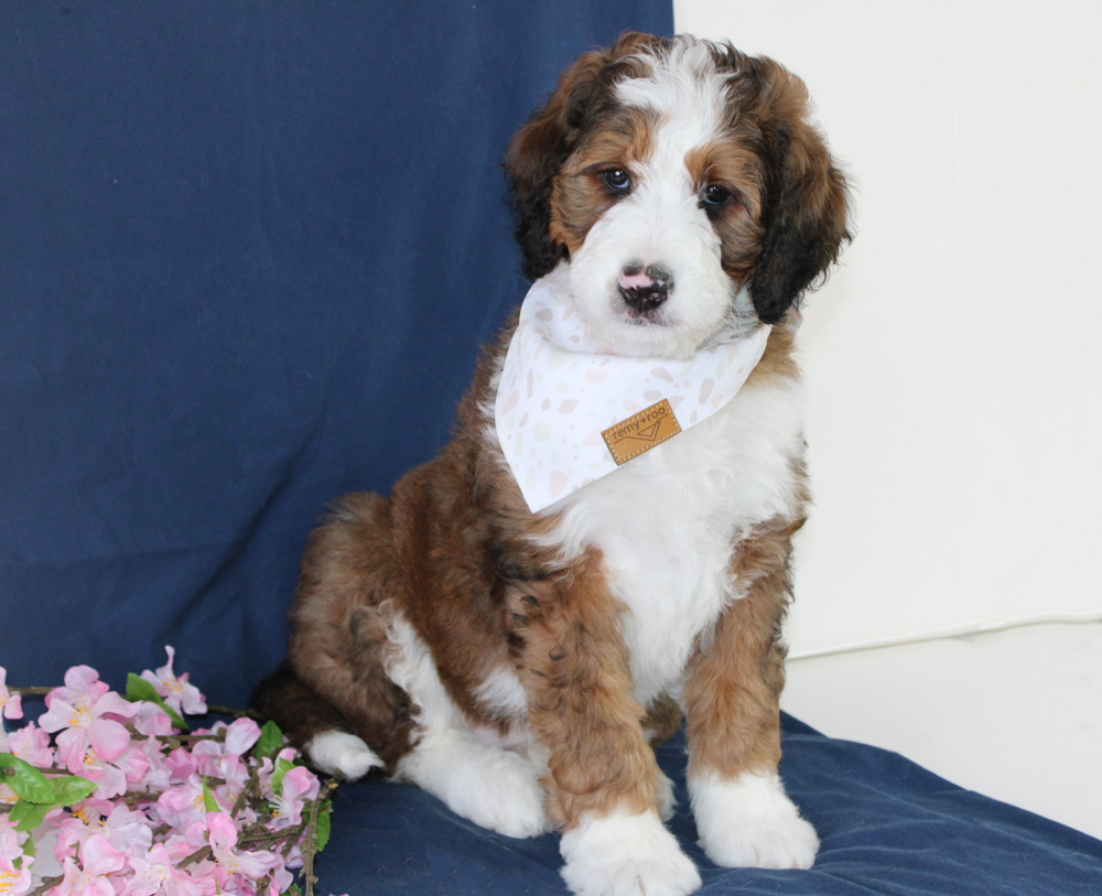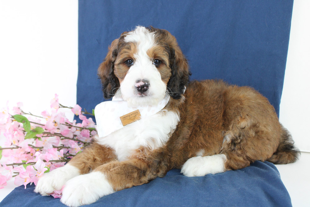The big sister who is more of a town gossip type, Sarie is always watching and keenly wondering what’s going on around her and how each interaction affects others! We love her desire to be a ham-parading herself around with gracefulness in her mind but clumsiness tripping up each step of her limbs! She is intuitive and intelligent but Sarie might mask how much she actually knows by distracting your senses with her happy wags and delightful kisses! Our girl is determined to be your friend and once she’s done making her rounds checking on everyone’s business, will take her place of pride laying at your feet! If you are looking for your first Bernedoodle but want a standout personality that’s not too sassy- Sarie is ready to live you like a sis!