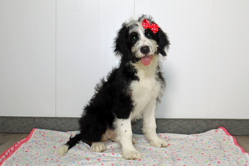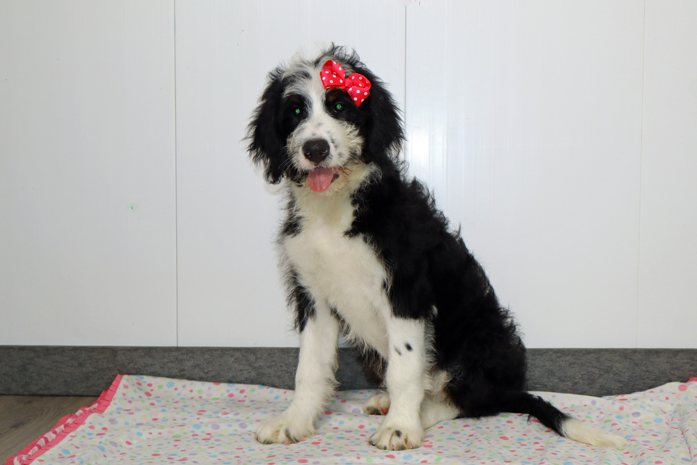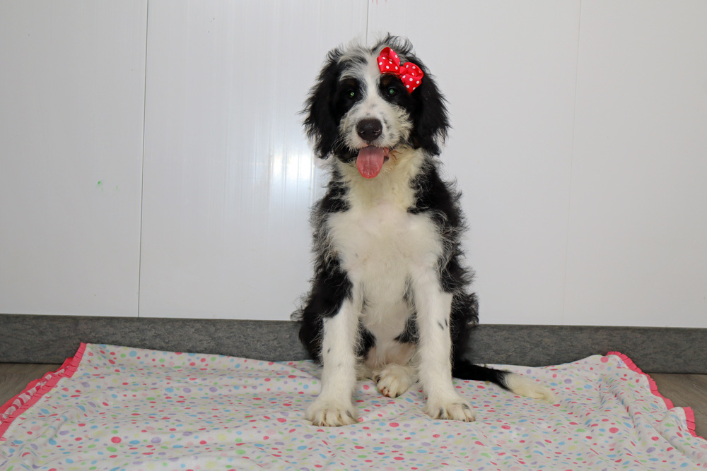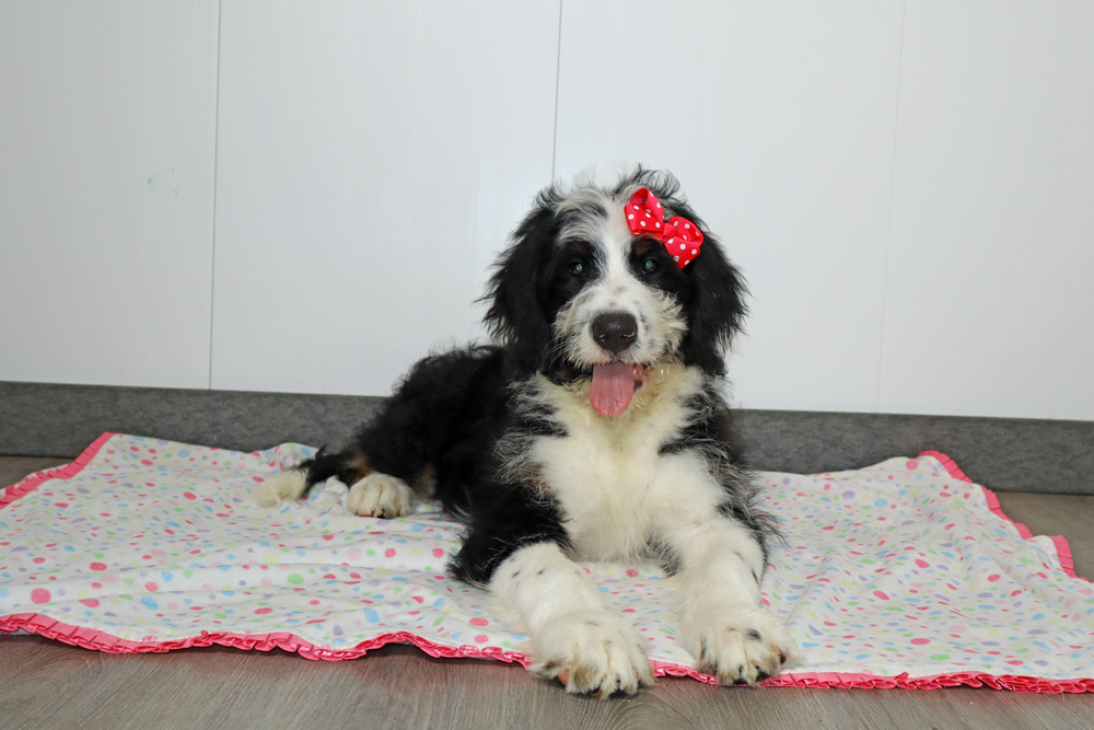 Perhaps we should have named Wendy Lucy because her personality reminds us so much of the Peanuts character! This puppy has the girl boss thing down and knows exactly what she wants- from toys to social interactions- those poodle genetics thrive on particularities and details in her surroundings while the Bernese side keeps her calm, cool, and collected! Expect Wendy to be sassy and silently meddling in everyone’s affairs like a legit secret agent who has a plan to dominate a situation while remaining super mellow! Our girl definitely has a streak of ornery and will have a fear of missing out if she feels that she’s been left out of some sort of epic adventure so her humans should intentionally include her in their lives without allowing her to become queen! If you like a bold yet sly companion who has the smarts to problem solve and keeps detailed mental records- Wendy is ready for adventure at a 007 pace!