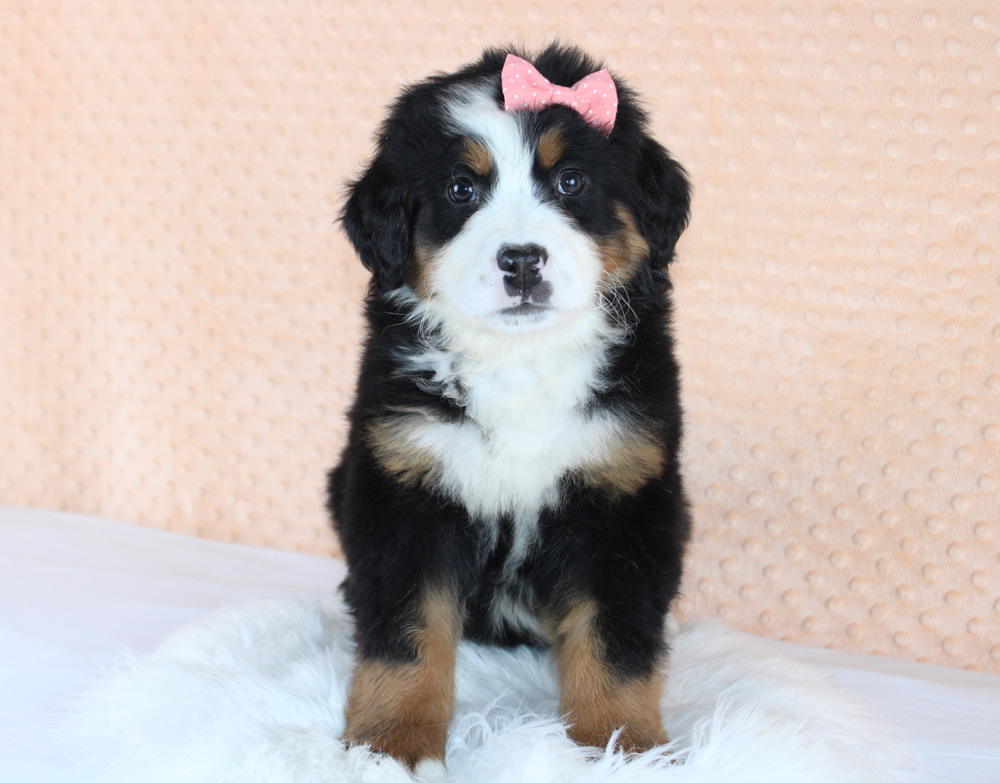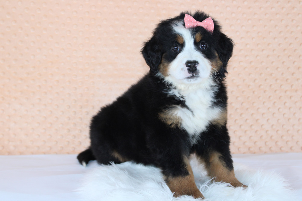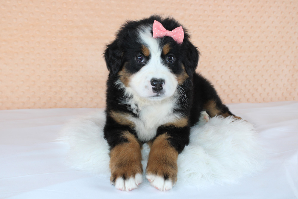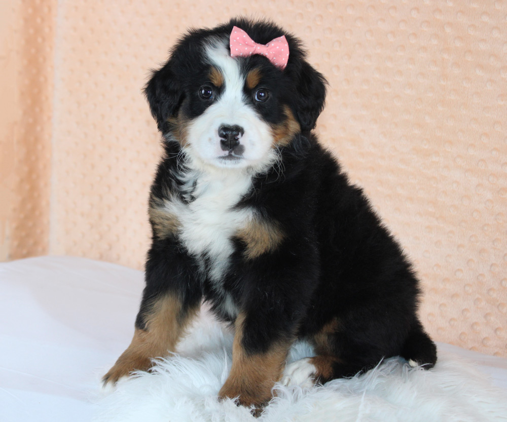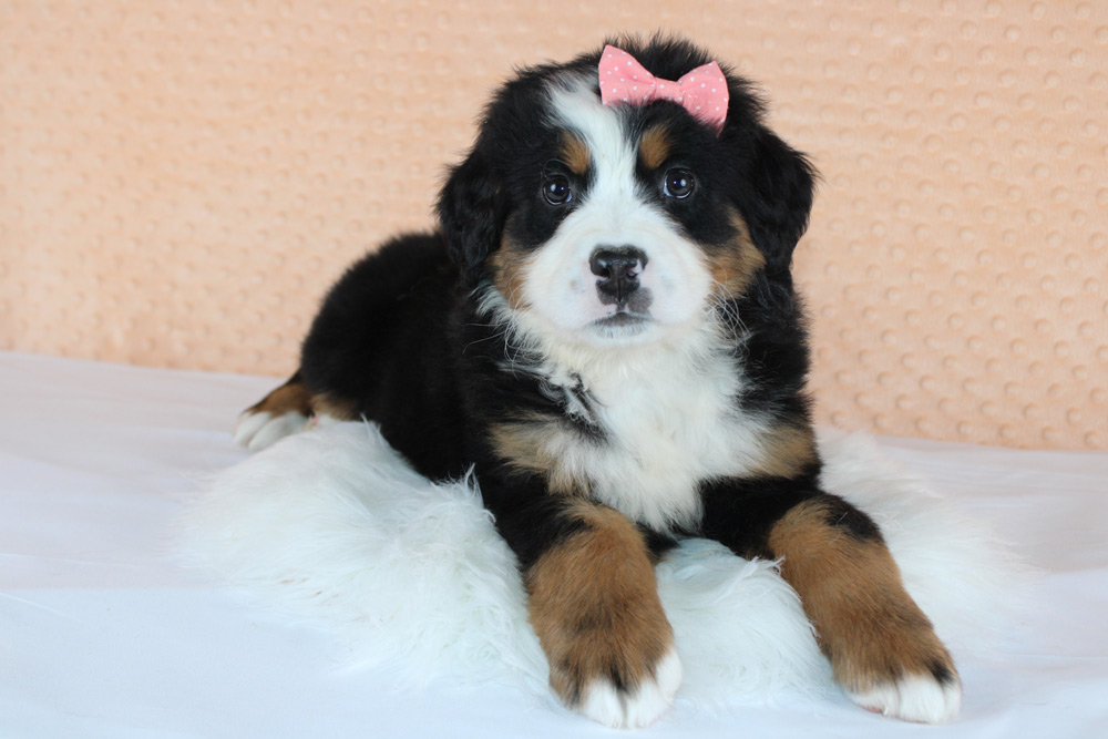 We all know the story of the boy who cried wolf but Korena still hasn’t learned that lesson yet because she may howl at random while wagging her tail just for the thrills of being a bit of a dramatic prankster! She adores playing with a ball- if it’s rolling this girl goes into her huntress stance and engages all of her senses before she dives in for a pounce! Korena will keep up with those instincts for gaming while playing with her other toys as well- showing off her tough side while shaking the toys or dragging them somewhere secret to be chewed on! This girl loves attention and reassurance for a job well done and will sit at your feet in anticipation for what’s next! Although our pup loves to lounge around, she has a drive to always be alert and get things done. Bernese have been known to be good for keeping an eye out on a family property and we believe Korena is going to make that perfect blend of a family dog and working dog! If you live in a rural area and want lots of love and extra security- Korena is the girl for you!