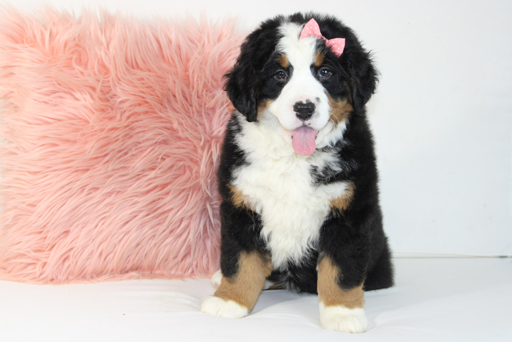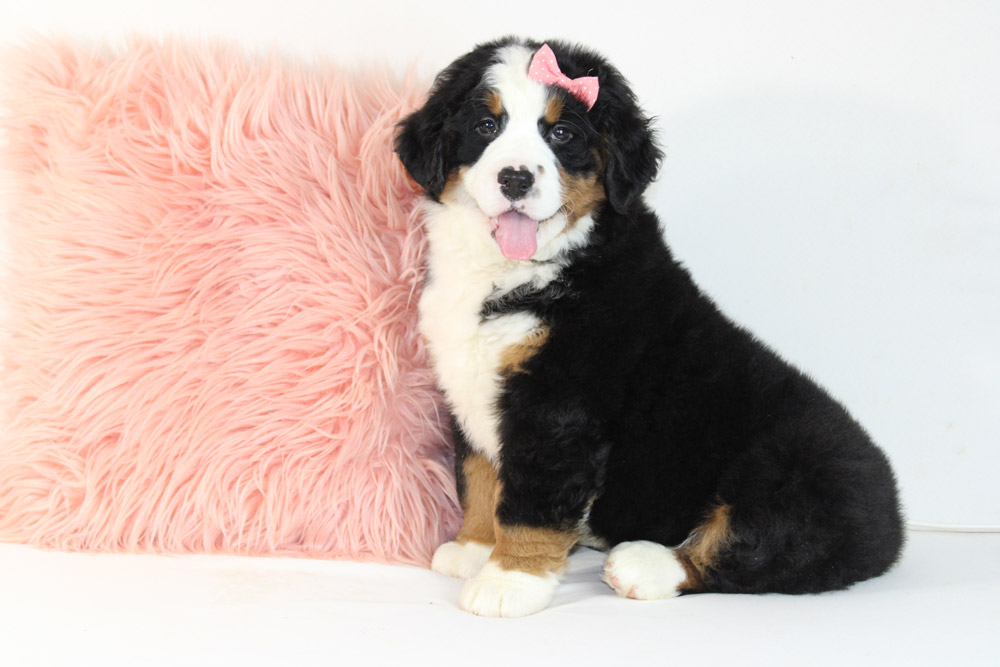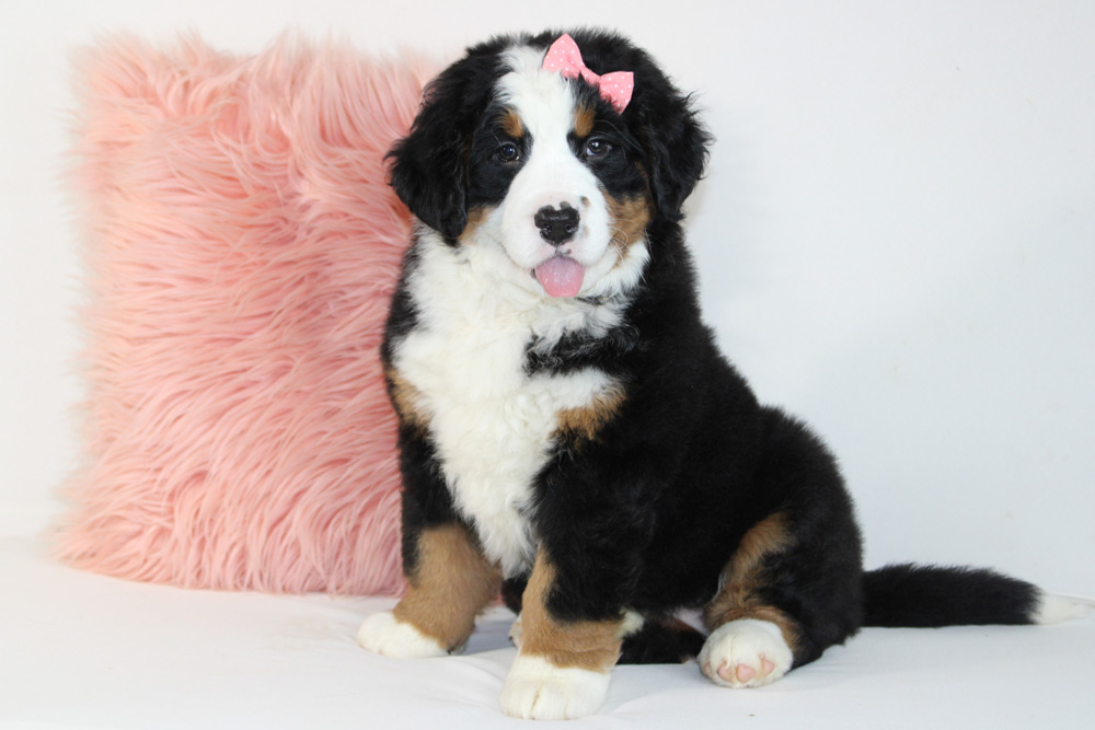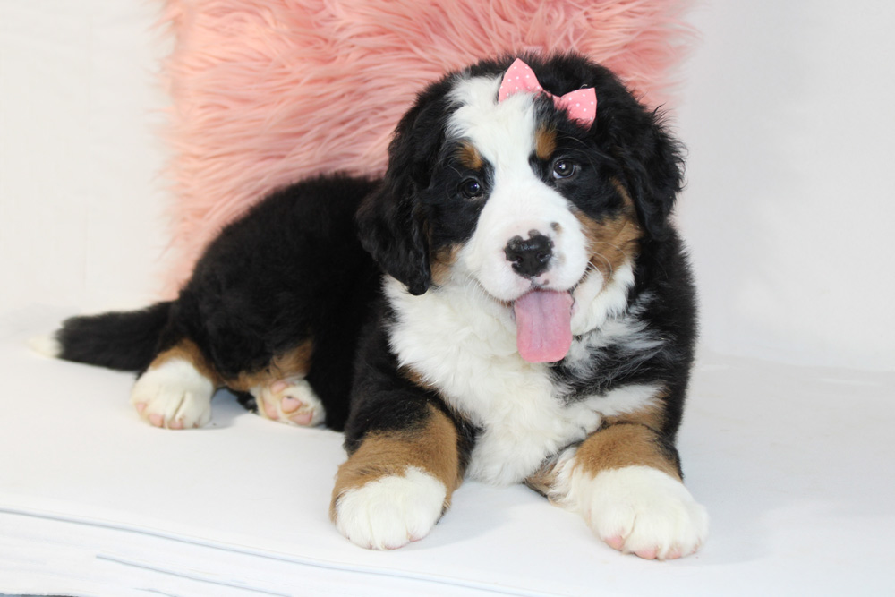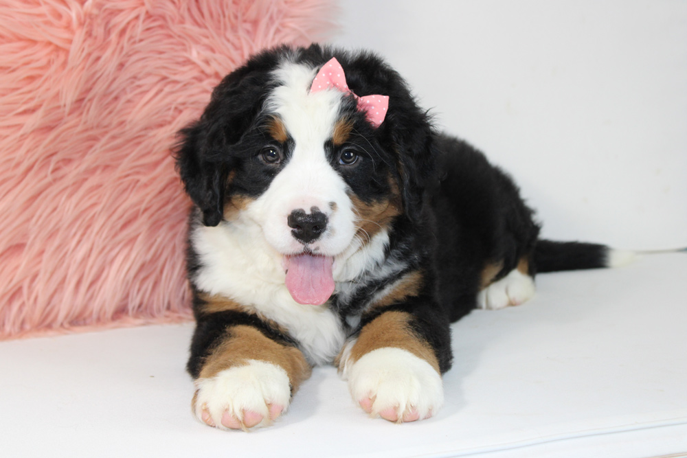 If there was a dramatic reality show for canines we bet Pettle would be cast as the comedic personality! This girl is funny and confident- not a shy bone in in her big Bernese body! She exudes happiness and shows her adoration for others giving kisses as if they were candy at a kids parade- anything to keep working her audience to fill her love tank. Pettle is curious, determined, and has a few naughty streaks you may not notice because she wraps them in her silly antics so you will be pleasantly distracted! From laying haphazardly on her siblings to sweetly placing a paw on your leg to get your attention- one thing is clear to us- we have a total ham in our kennel who is aching to be the star of her forever family’s life!