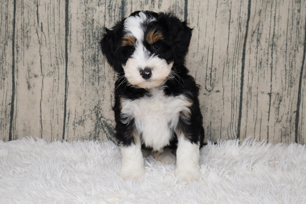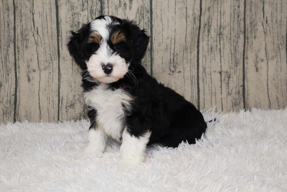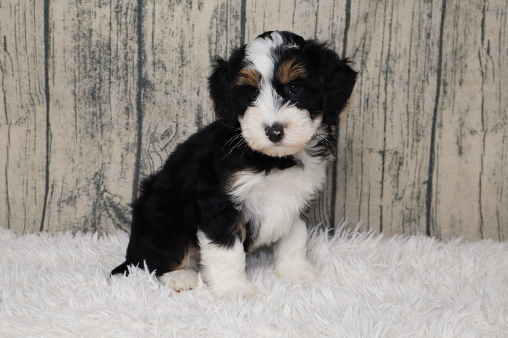 Looking for a micro Bernedoodle who has a very bernese leaning temperament? We think Tinker takes that easy-going nature and provides a sense of peace to balance out his littermates! He is gentlemanly, full of affection, and keeps his heart in a state of patient gratitude towards others so he is well respected by all! Expect this pup to be a quiet independent investigator with little bursts of joyful play or step in to calm others by standing over them as he uses his energy as a natural damper to their angst! If you are looking for an easy going leader of kind and humble- Tinker is the one for you!