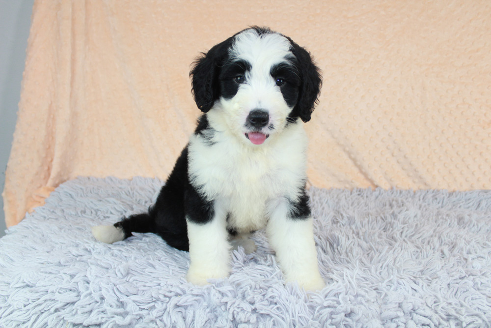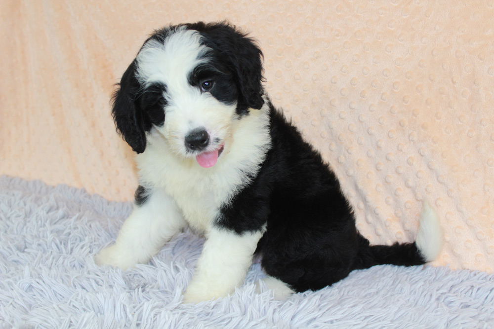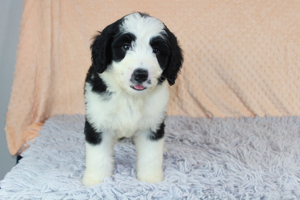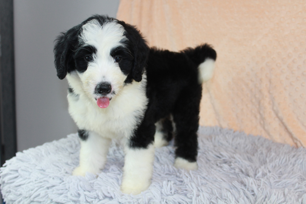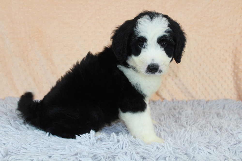 Alec has a unique Black/White coloring ! He calm and intelligent and has the loving temperament of a Bernese Mountain Dog but also passes on some of the Hypo-Allergenic and non-shedding qualities as well as moderate size that we all love so much about our Mini Poodles!
