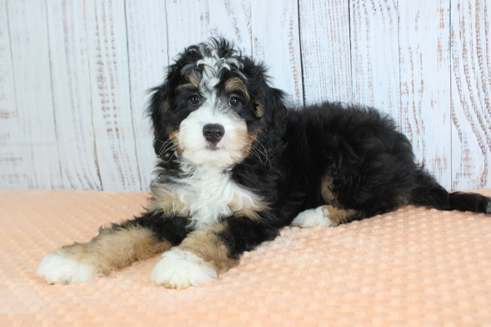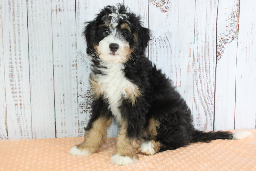A little ball of joyful fun is what sets Alyssa apart from her siblings! She is socially confident and has unofficially become the biggest influence when her siblings are on the hunt for some good ol’ fashioned fun! We love watching the heart our girl has for others- a true joy in making acquaintances and building camaraderie within the pack while building up other’s boldness but will still lean into that lazy bernese side when all the initial excitement has run its course! Alyssa is very pack centric and loves to calmly loves to simply lay and play at your feet if there are no other canine cohorts she can find for her little imaginative adventures! If you are looking for a well-rounded puppy pal for the kids- Alyssa is ready to take her role as ‘man’s best friend’!