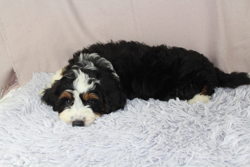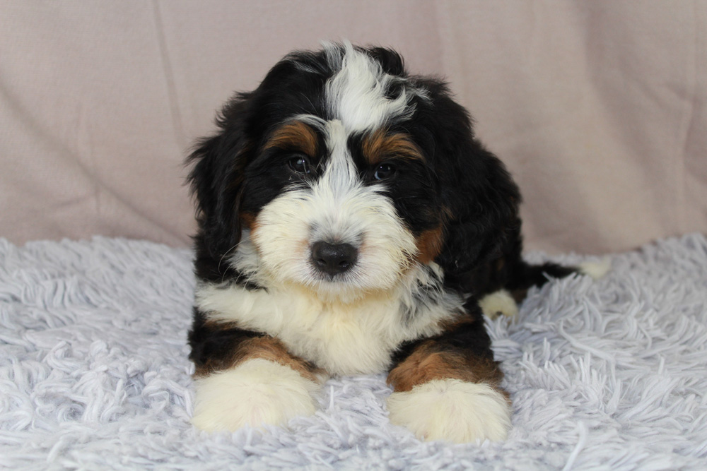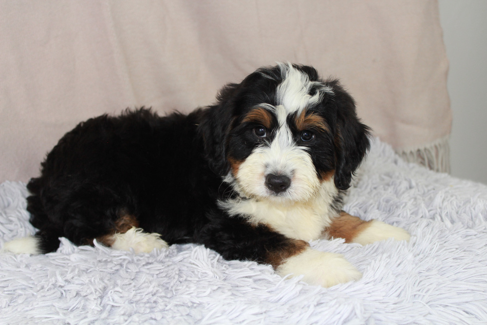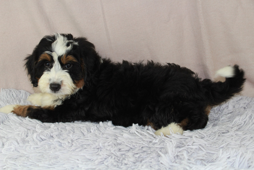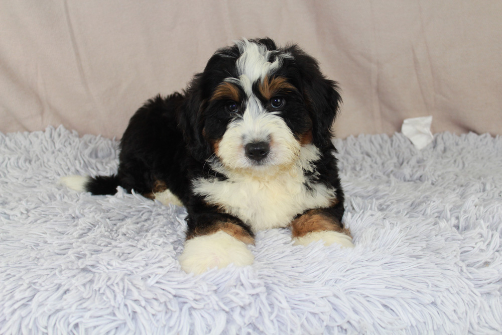 Bernard is a gentle giant!! He is a lap dog and will be very content to just chill. Bernard still loves to play though. He has a beautiful tri colored coat with a nice white chest! Contact us today to make him your own!!!!