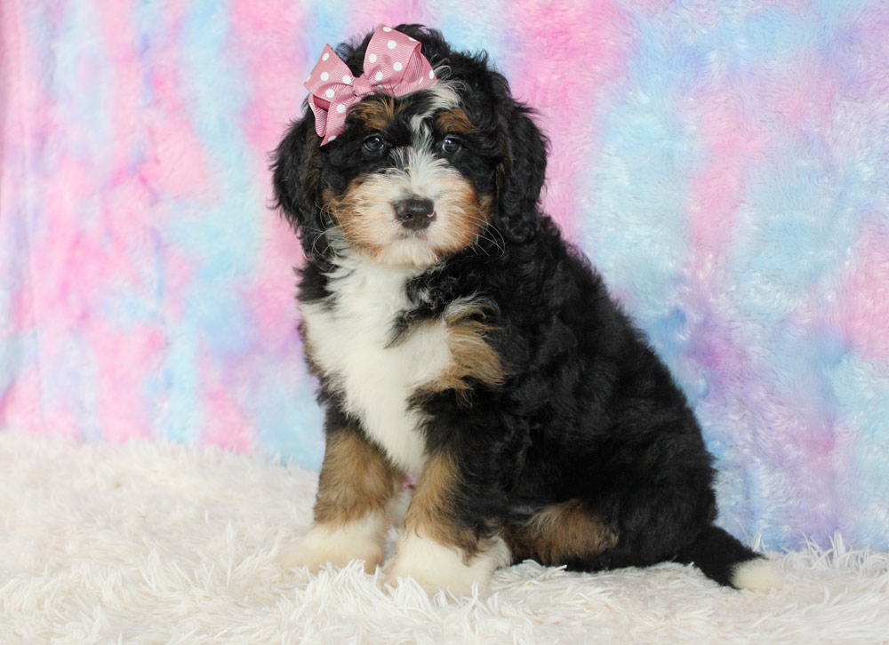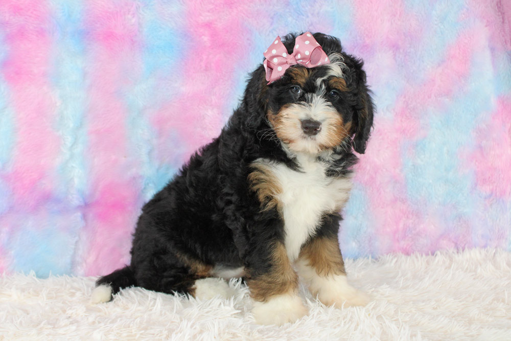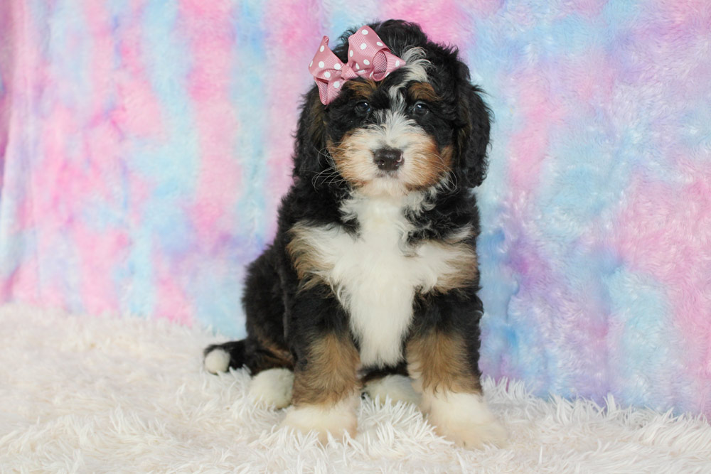 Sometimes we feel like our dogs seriously could have been a human in a previously life and Bonnie is no exception! She is super calm and lazy, but a bit opinionated much like a picky old lady! Our girl is quick to make friends and connections- feeling the love and energy of fellow canines as well as humans to be only a positive thing so don’t be surprised if she saunters over to your feet and is perfectly content laying there with wags, smiles, and lots of kisses as if she’s known you from decades ago! Bonnie is definitely more lazier and lower energy than her littermates taking on more of a bernese temperament. Though she’s calm and stoic, she has no problem bossing her siblings from afar to get them to calm down- so going to a home with older kids or an empty nest would be best! If you are looking for the companionship of an old soul- Bonnie is the one for you!