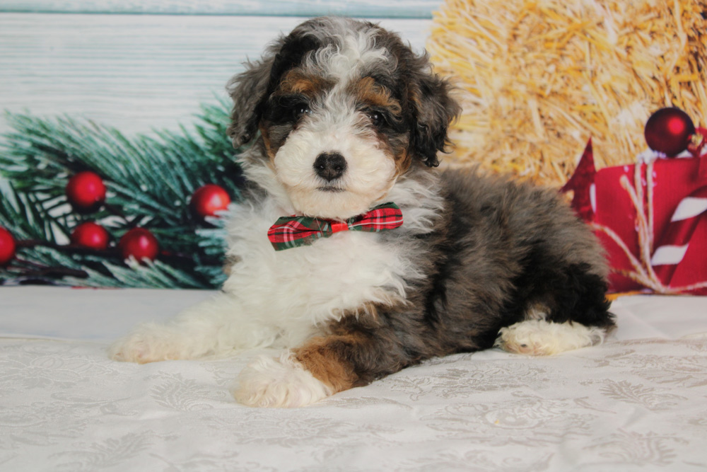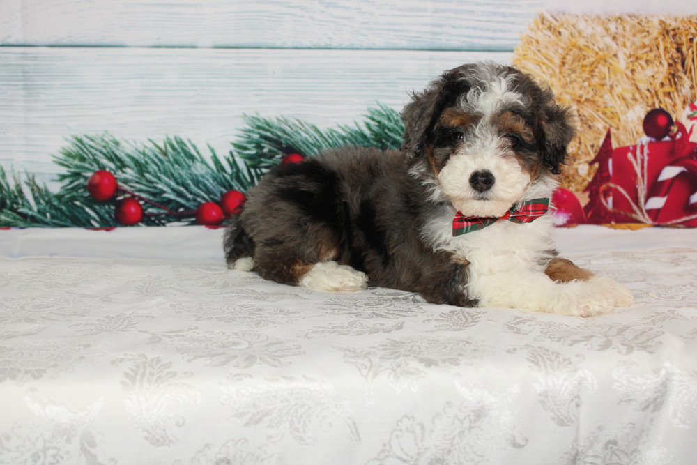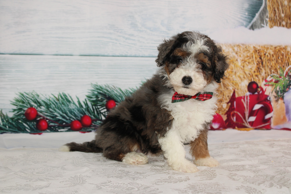 Snuggly, sweet, and everyone’s best buddy- Boots is the kind of dog who is the glue that holds his pack together! He is playful yet kind, confident while staying humble, involved and willing yet super easy going! Our boy literally defines ‘go with the flow’ while still having a subtle inquisitive mind! Boots is the dog that all his siblings follow for fun, or hang with when they need an instant best friend! When he’s not playing with a littermate you can see Boots befriending a plush toy or checking in to see if us humans need an extra dose of his scrumptious heart! If you are looking for a more Bernese leaning temperament with the benefit of being small and extra hypoallergenic- Boots is the boy for you!