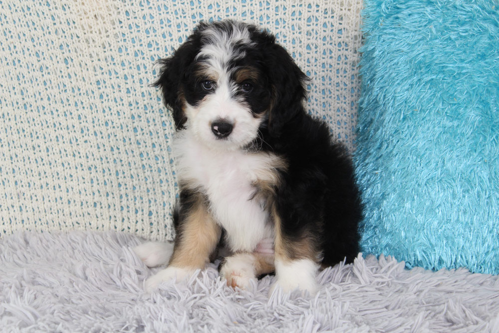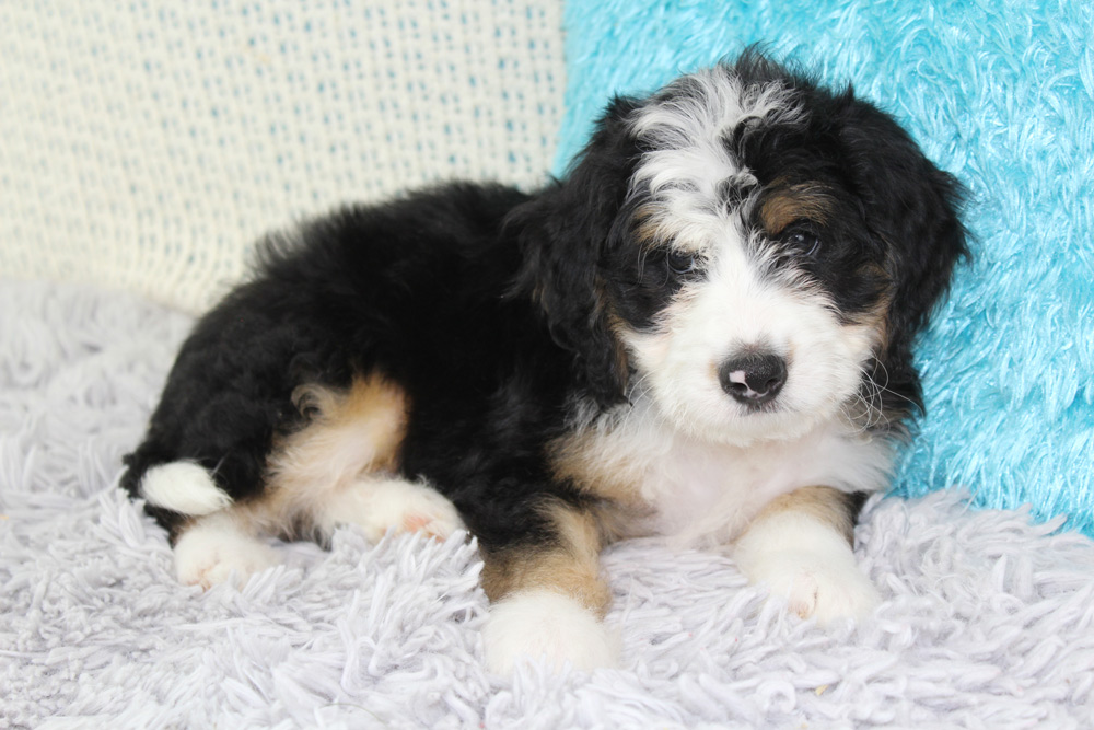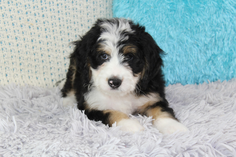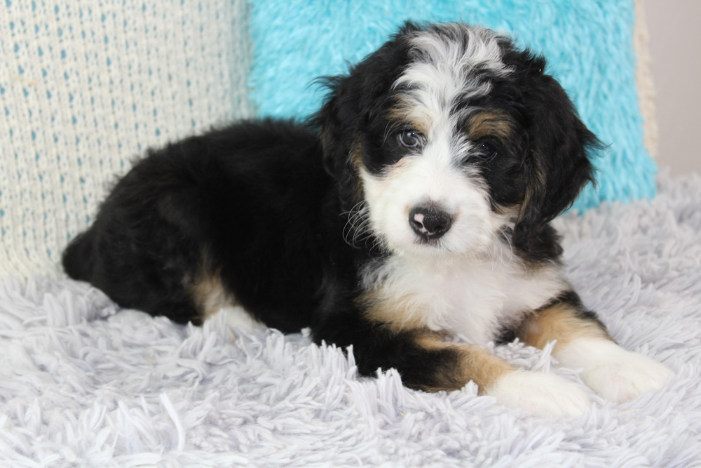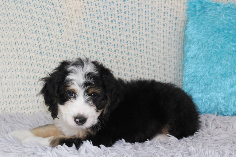 Brad is the quintessential lazy Bernedoodle- taking after his mother’s Bernese mountain dog ways- this boy has very little care in the world besides playing with his brothers. If they have a toy he wants, no problem! Brad’s technique to snatch toys away from his siblings is to lay or sit on them! We love his mild curiosity and go-with-the-flow attitude towards life! Brad will be a bundle of sweet beta boy vibes who will enjoy watching the world go by just as much as he will enjoy joining you on your family adventures. If you are looking for a first-time puppy to join your pack, Brad would make a solid forever friend!