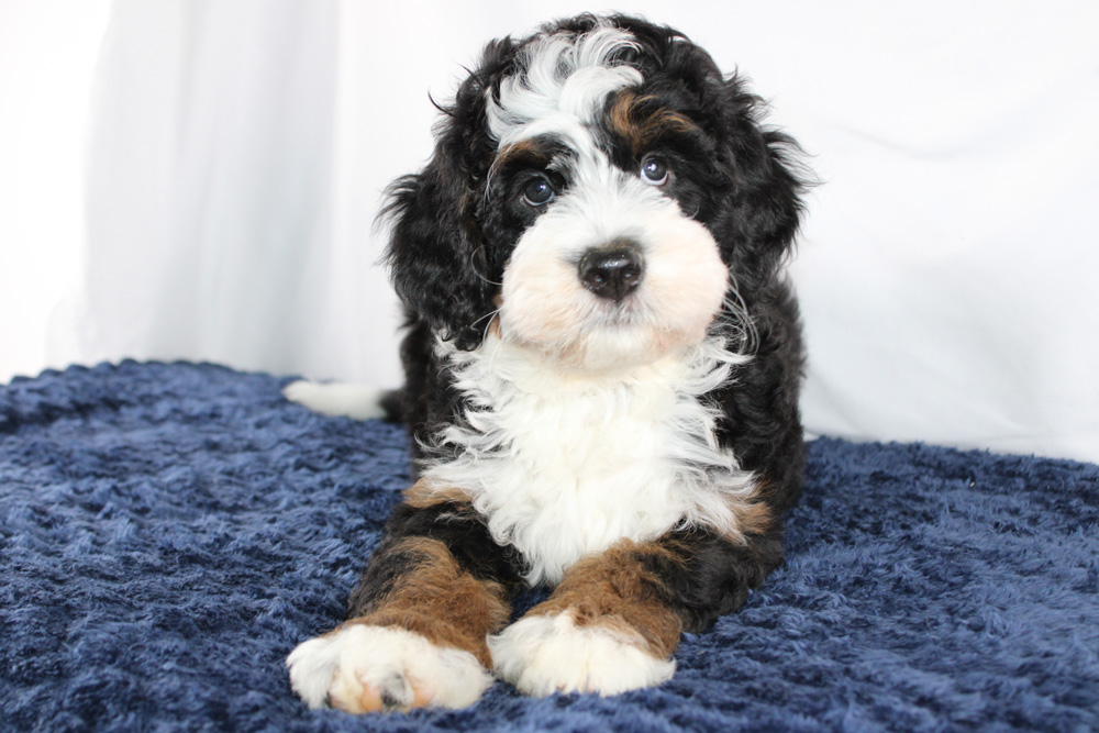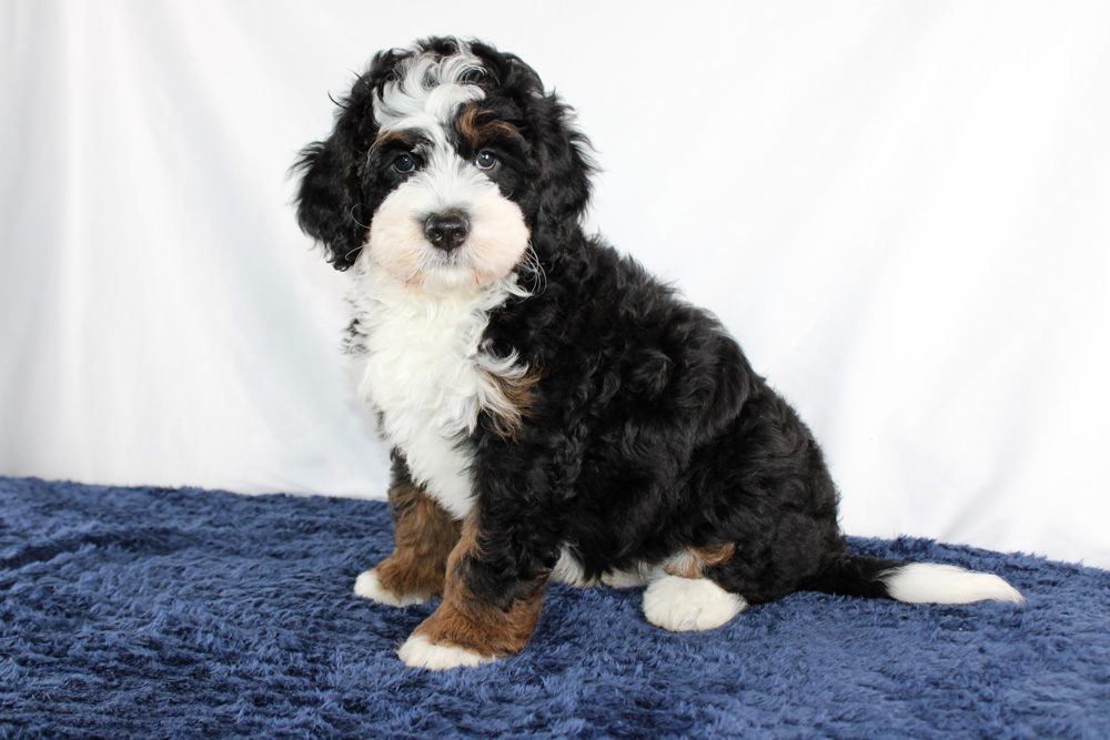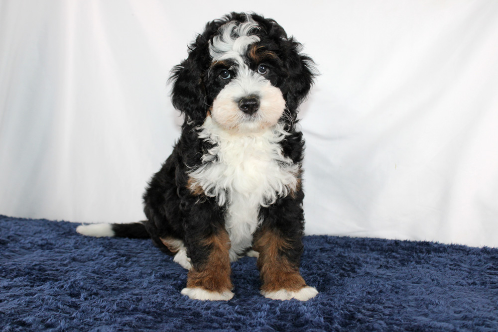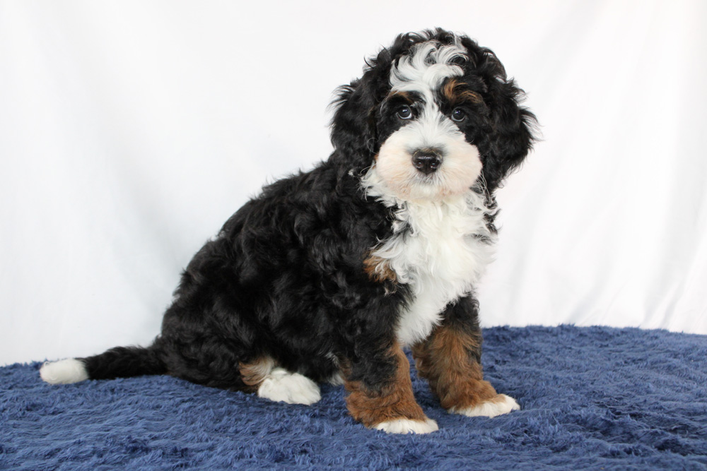 If Kai had a human profession- we think he could pass for an old man mechanic who pops a few brewskies on the job! Watch this boy’s laziness be the ultimate guide to his adventures- sliding his way around the toys but still inspecting every detail of each and every one of them! He is clumsy, oafy, but oh so intelligent in his ability to problem solve and stay focused on a task- as long as that task doesn’t exert too much energy! We love his flopsy exaggerated mannerisms mixed with his affectionate side! He uses his sweet kisses as a springboard into launching a campaign to annoy his sisters as if it were his primary love language- so don’t be surprised if this Casanova quickly turns into a trickster! Kai is a super casual guy looking for a home where he can be revered as both a living bear rug as well as the class clown! If you love the lazy bernese temperament- Kai gets top marks for being just like mom!