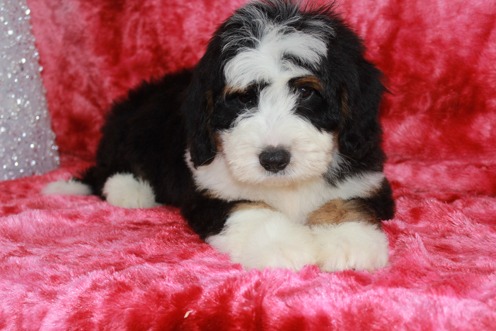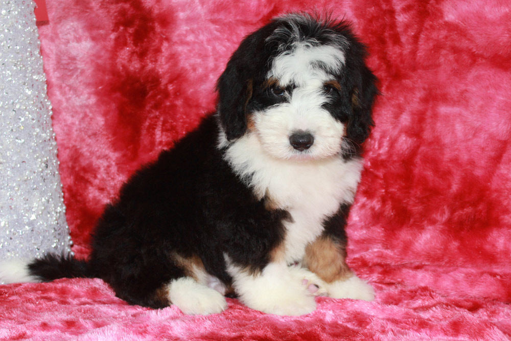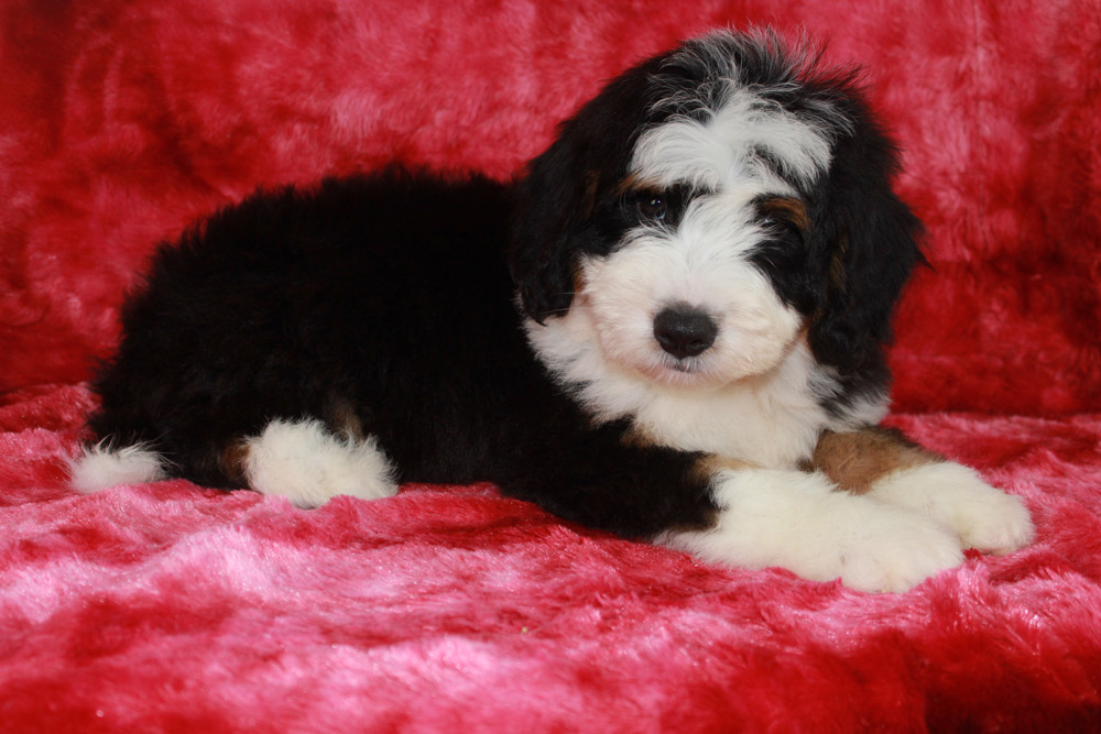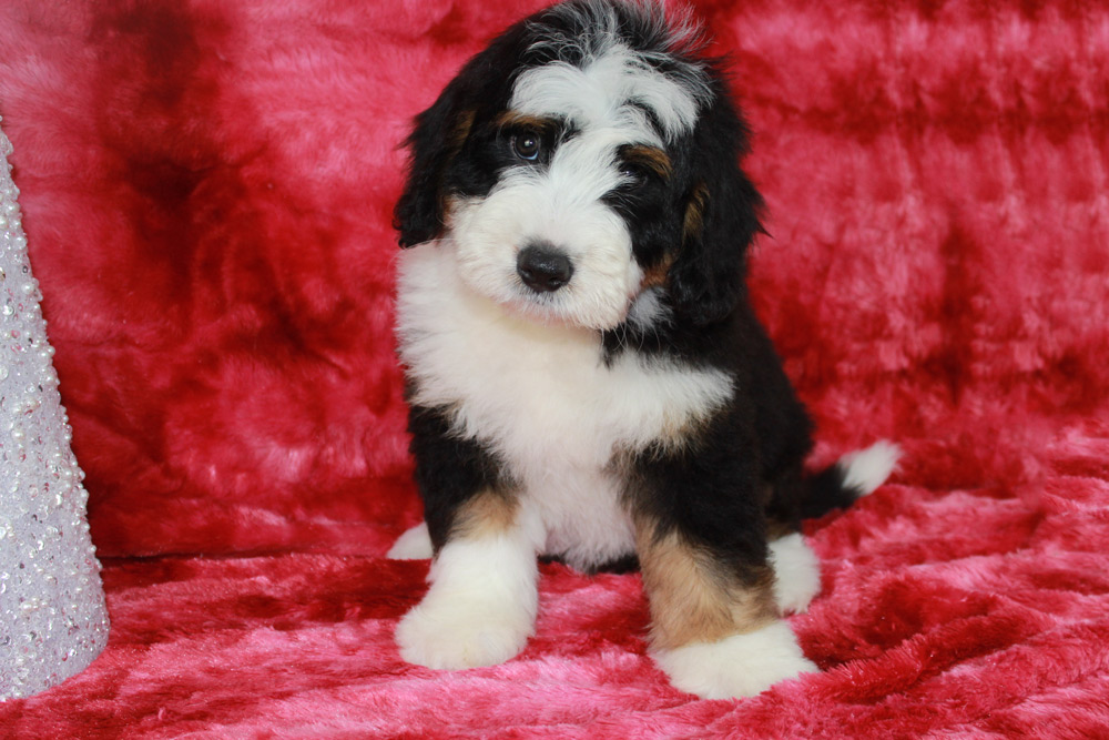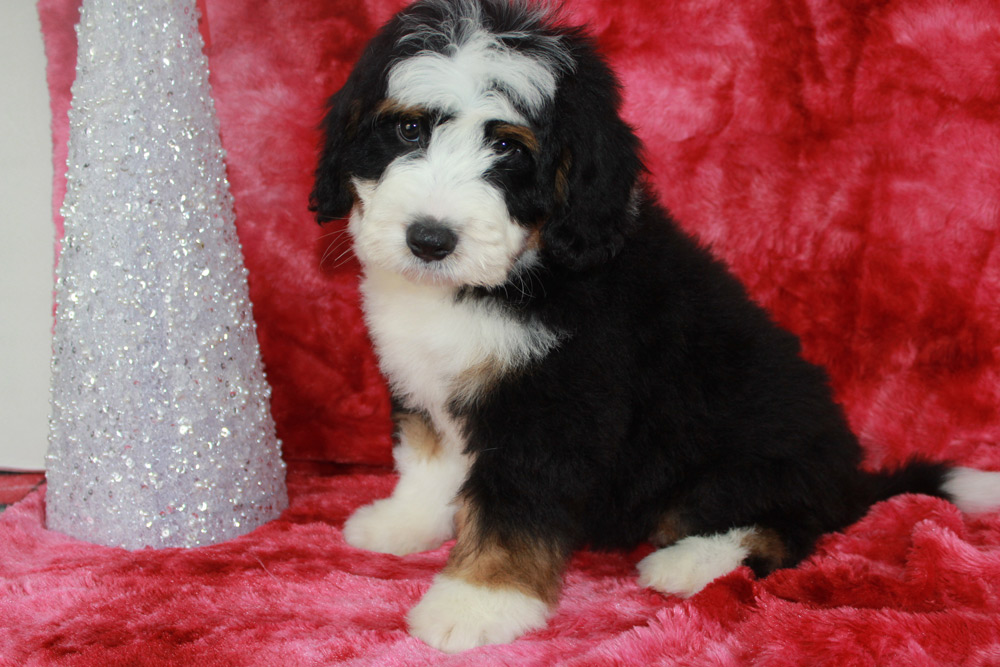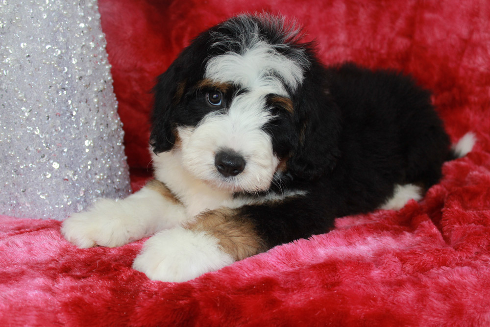 Lawson is the president of playtime and commander in chief of snuggles all wrapped into one big oafy puppy! This boy has the Bernese mannerisms we all love with the pep in his step of a poodle! He is happy, super social, and isn’t afraid to dive right into the action. In fact- you can find Lawson taking over toys by casually sitting on his siblings and dominating their play time with his oafy tactics. We love his jovial spirit and love for community and know he’s going to make one heck of a play partner to some lucky kids this Christmas!