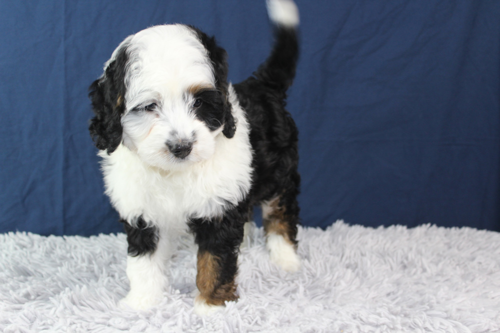 It’s a rare combination to have both beautiful markings on the outside and delightful beauty on the inside! Orchid is just as impressive as the flower she’s named after with her graceful confidence, and quiet contentment. This girl has an energy about her that can calm the room or pivot to jovial play depending on what she can sense with the needs of others. Orchid may have some stubborn streaks she inherited from her Bernese mother- but she’s also inherited the relaxed way of life that will be sure to get lazier with time! If you are looking for a one of a kind puppy who is sure to win the hearts of many with very little effort- Orchid is the puppy for you!