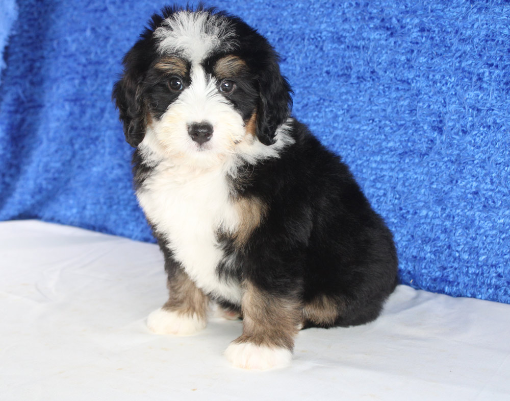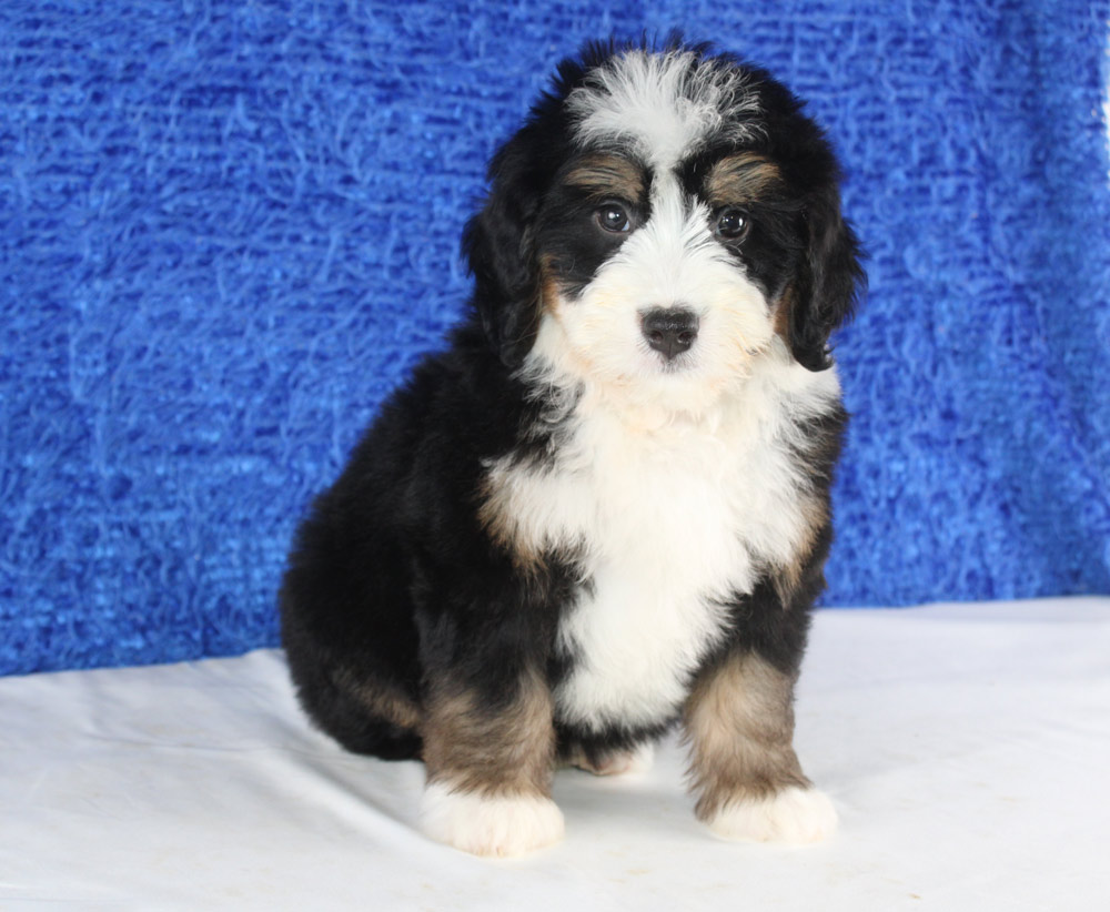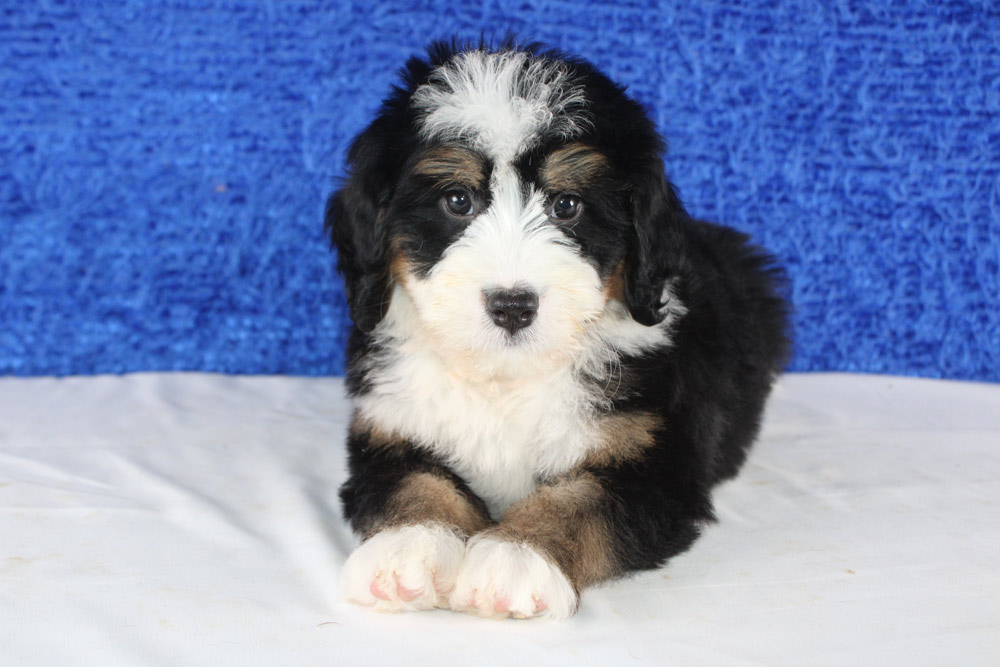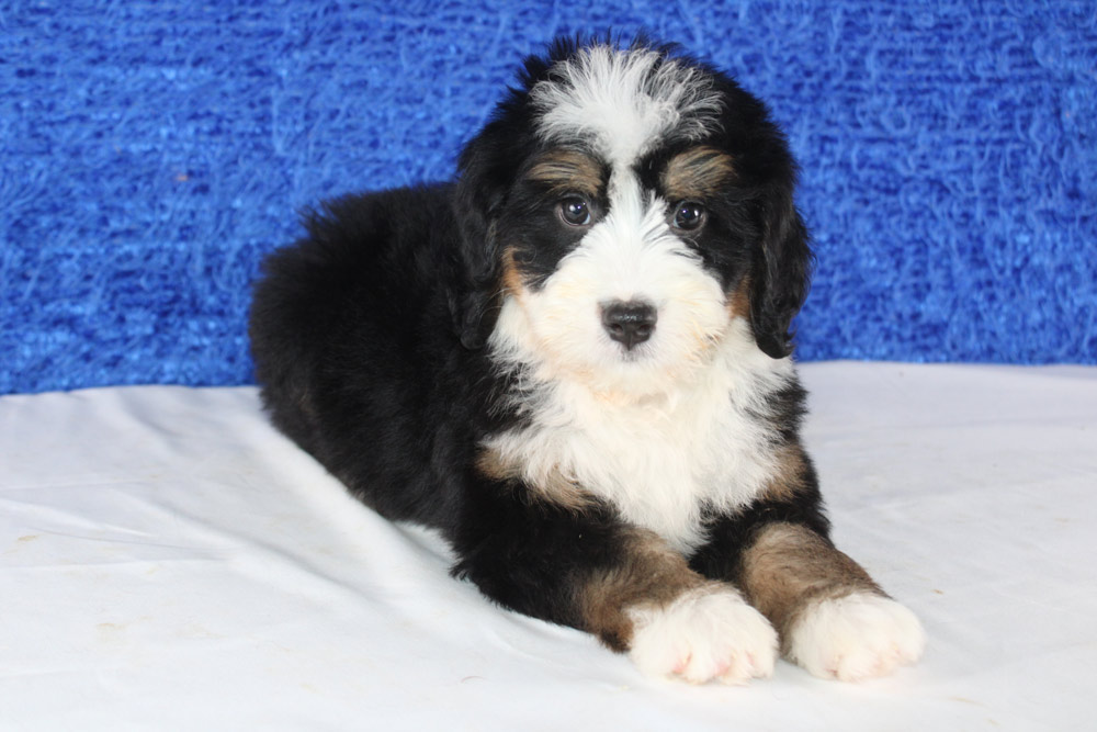 If you love that loungy, lazy bernese temperament Otis is definitely a pup who lives after his mom’s heart! He reminds us of Ferdinand the Bull- quietly hanging out among the flowers being a ‘gentle giant’ to all he encounters! Even though Otis prefers to lay and play with one toy at a time- he may feel the random inspiration to have a short burst of zesty energy or wander around with a mellow ease of intellectual stimulation as if perusing an art gallery. Our boy is both a top snuggle buddy among his siblings, as well as the most content go-with-the-flow creature we have at the kennel! If you are looking for a sweet soul to be your first puppy and have a home full of young kids or babies- Otis is as good as a stuffed animal that has come to life!