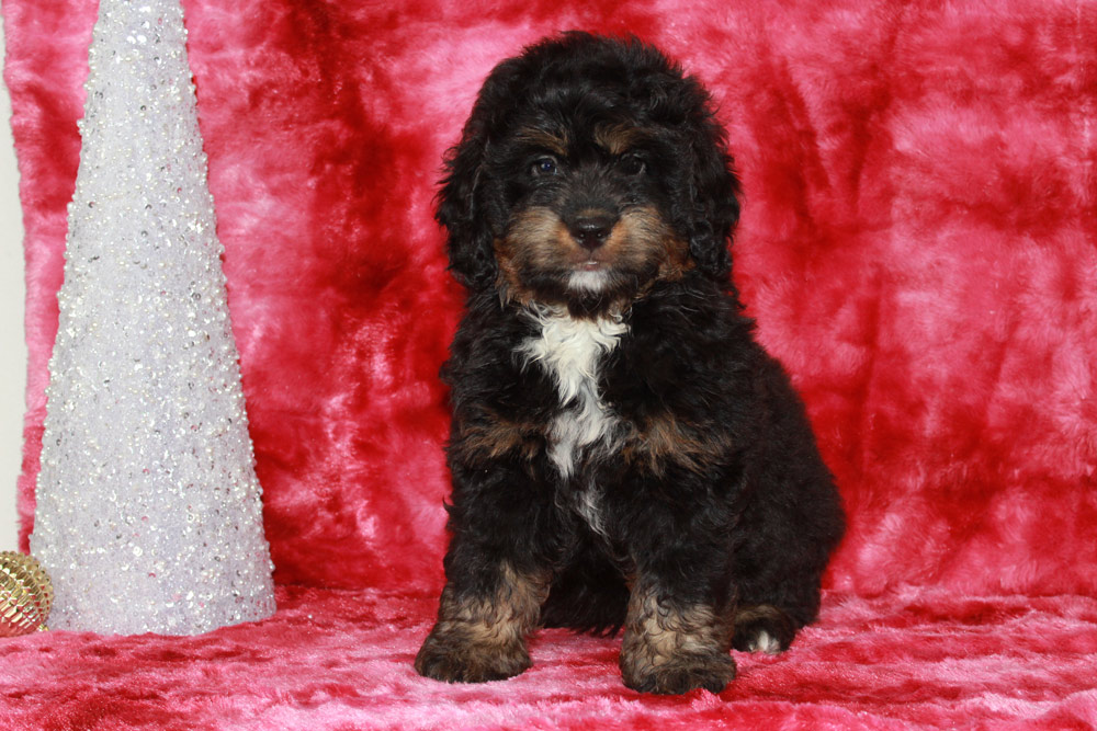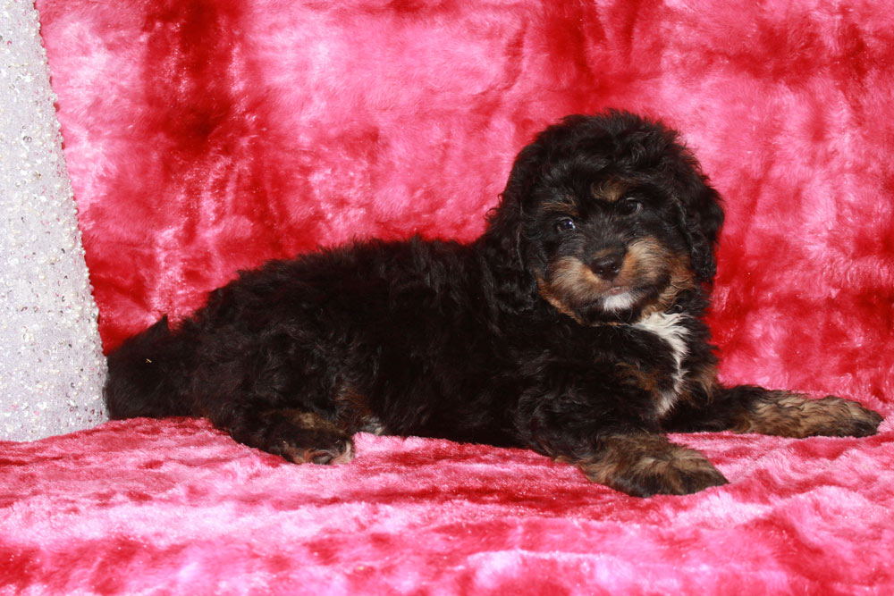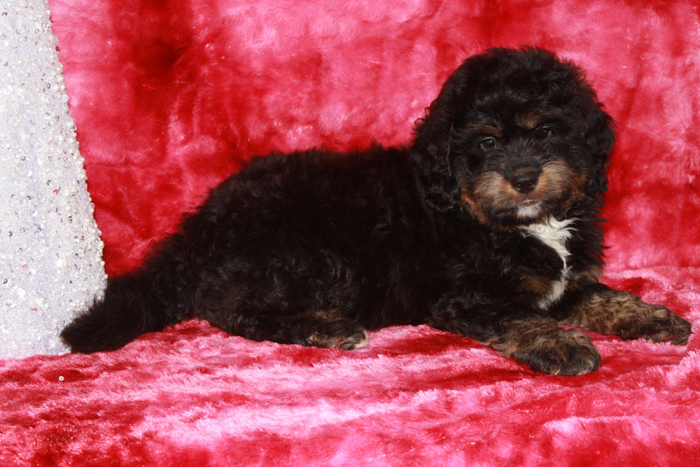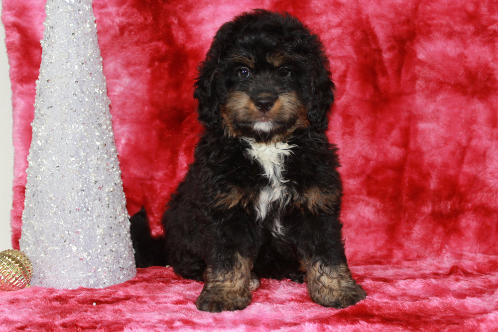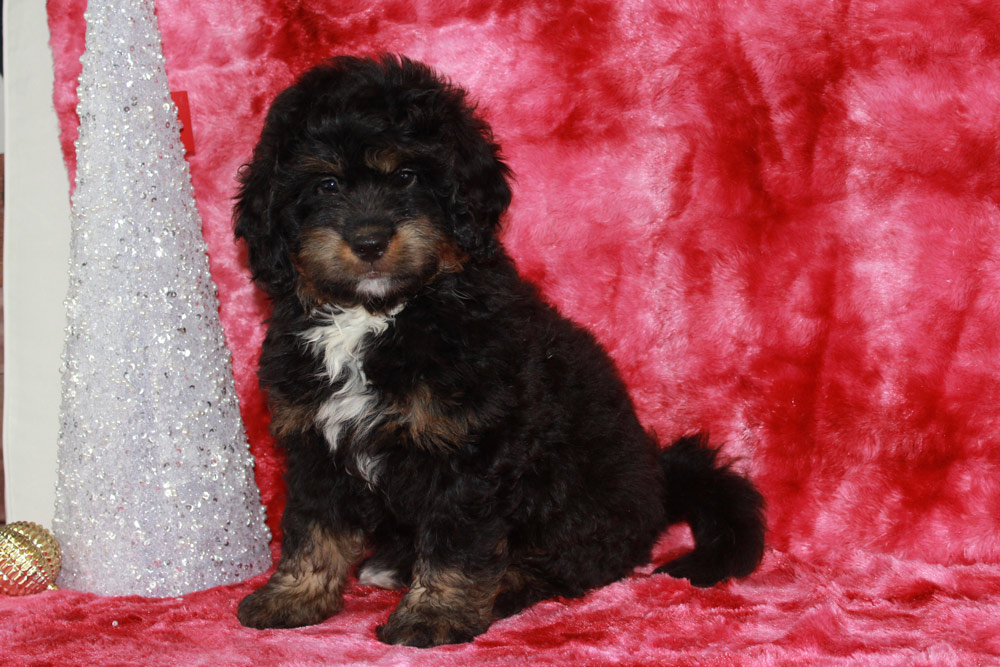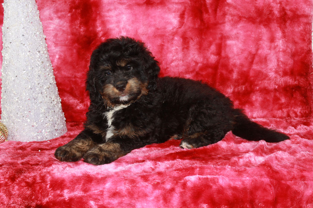 Even though he’s named after a giant cat, we can assure you that Puma is your quintessential Bernedoodle personality! He is super chill, and plays lazy- rolling around like he’s imagining to be on a velvety yard of perfect grass. Puma is expressive- when he plays or when he is craving your attention- he will let you know he needs you. You can find Puma laying at your feet or offering up a paw to random strangers when he’s not taking his nose on a curious jaunt around the room! Puma did show a slight underbite on his vet exam. This is only a cosmetic defect and doesn’t affect Puma’s health in any way. If you are looking for a sidekick to keep you company on the silent nights of wintertime- Puma is ready to pounce into your life!