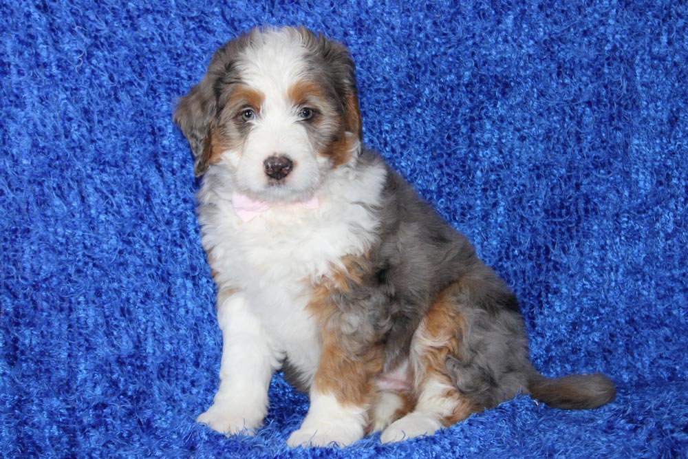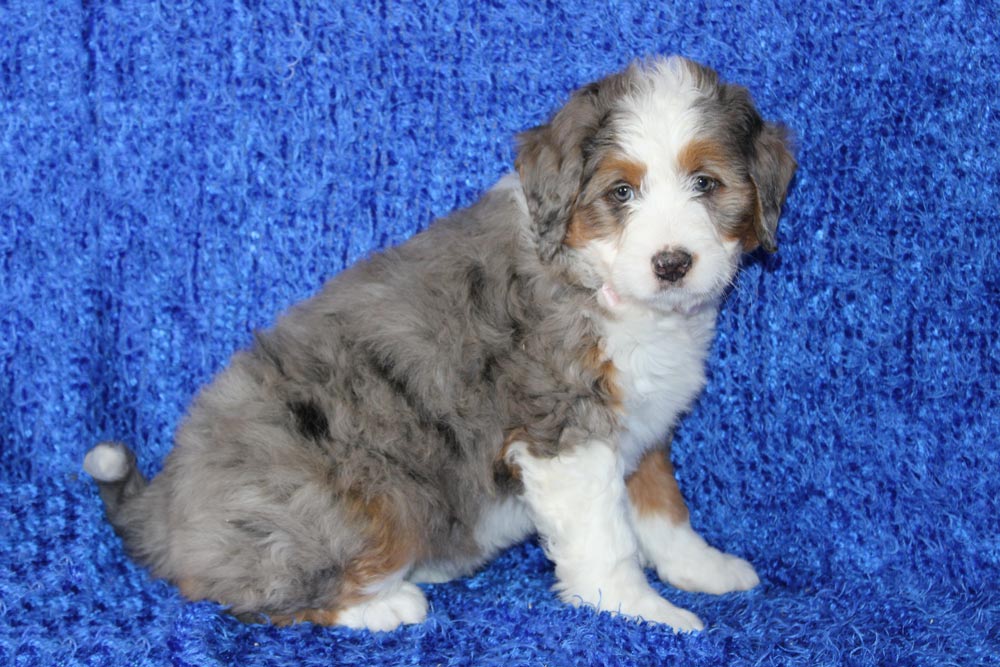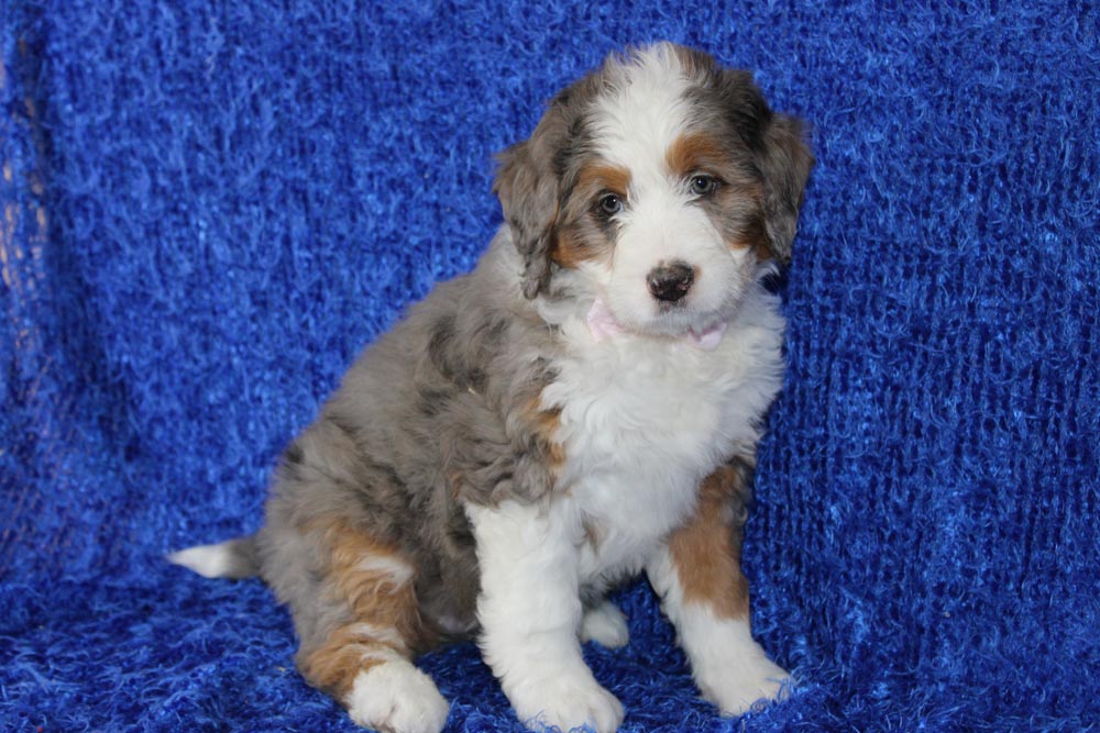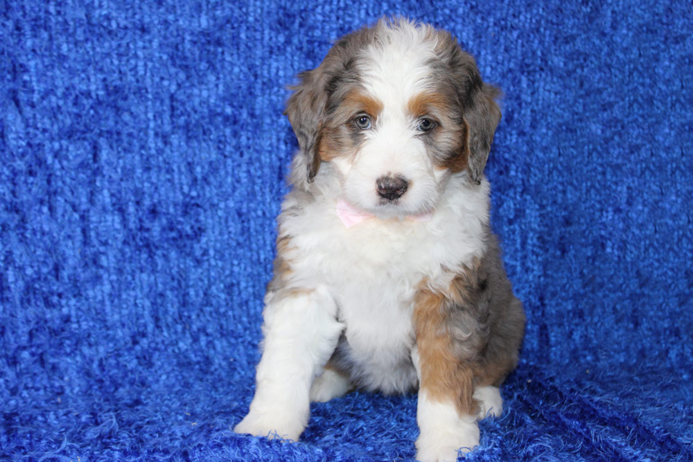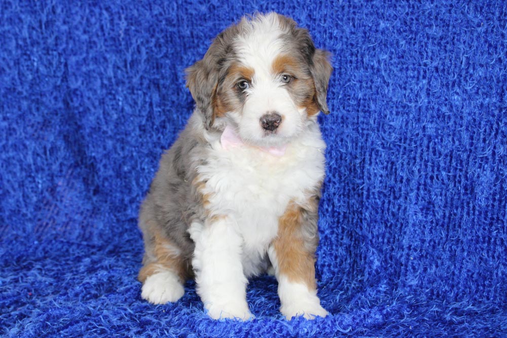 If you were hoping for a bernedoodle that had more of your quintessential Bernese temperament, Wyn is a gal who loves to lounge and happily watch the world go by with a smile on her face! We adore how she crosses her front legs anytime she’s ultra contemplative about one of her toys! Wyn’s naughty streaks make a brief appearance when her energy crescendos into any joy-filled play that involves more than just laying around. But not to worry- that burst of energy quickly falls right into a deep snuggle session or peaceful nap time. Wyn is looking for a lazy family when it comes to activities- but an active family when it comes to learning!