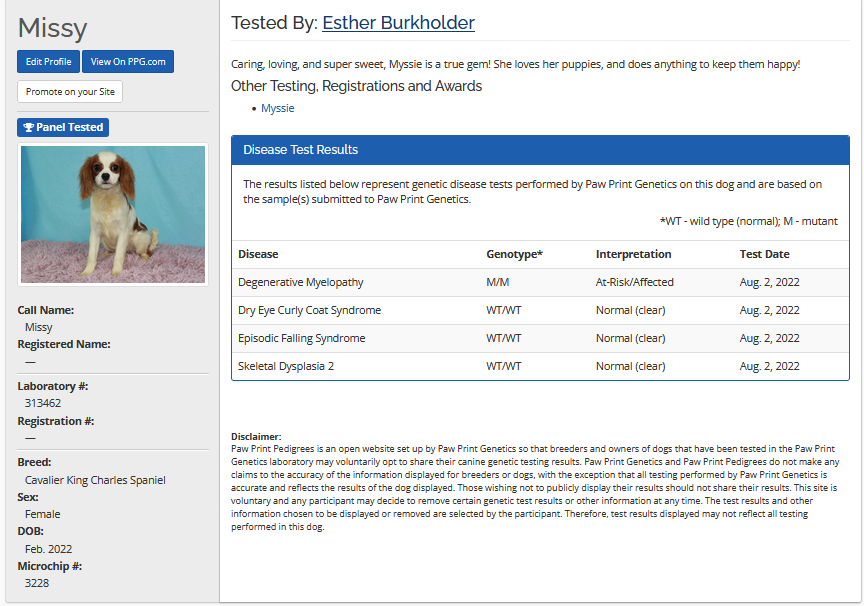 Myssie is a friendly Cavalier King Charles Spaniel mom who loves attention! She has passed on her sweet heart of gold to her beautiful puppies! Myssie is such a sweet and caring mother to her pups.