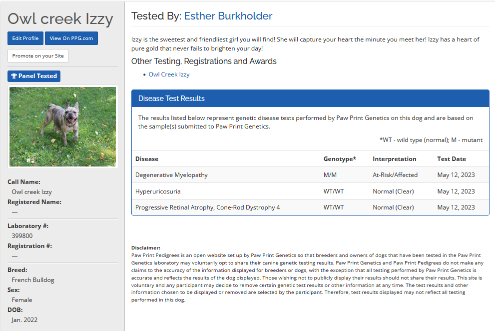 Sweet Izzy girl has a heart of pure gold that never fails to brighten your day! She is a true gem with a sweet, caring, and friendly personality! Izzy is an awesome family pet, and amazing mother to her pups!