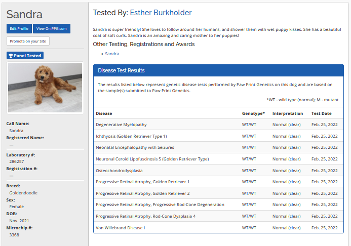 Sandra is super friendly! She loves to follow around her humans, and shower them with wet puppy kisses. She has a beautiful coat of soft curls. Sandra is an amazing and caring mother to her puppies!